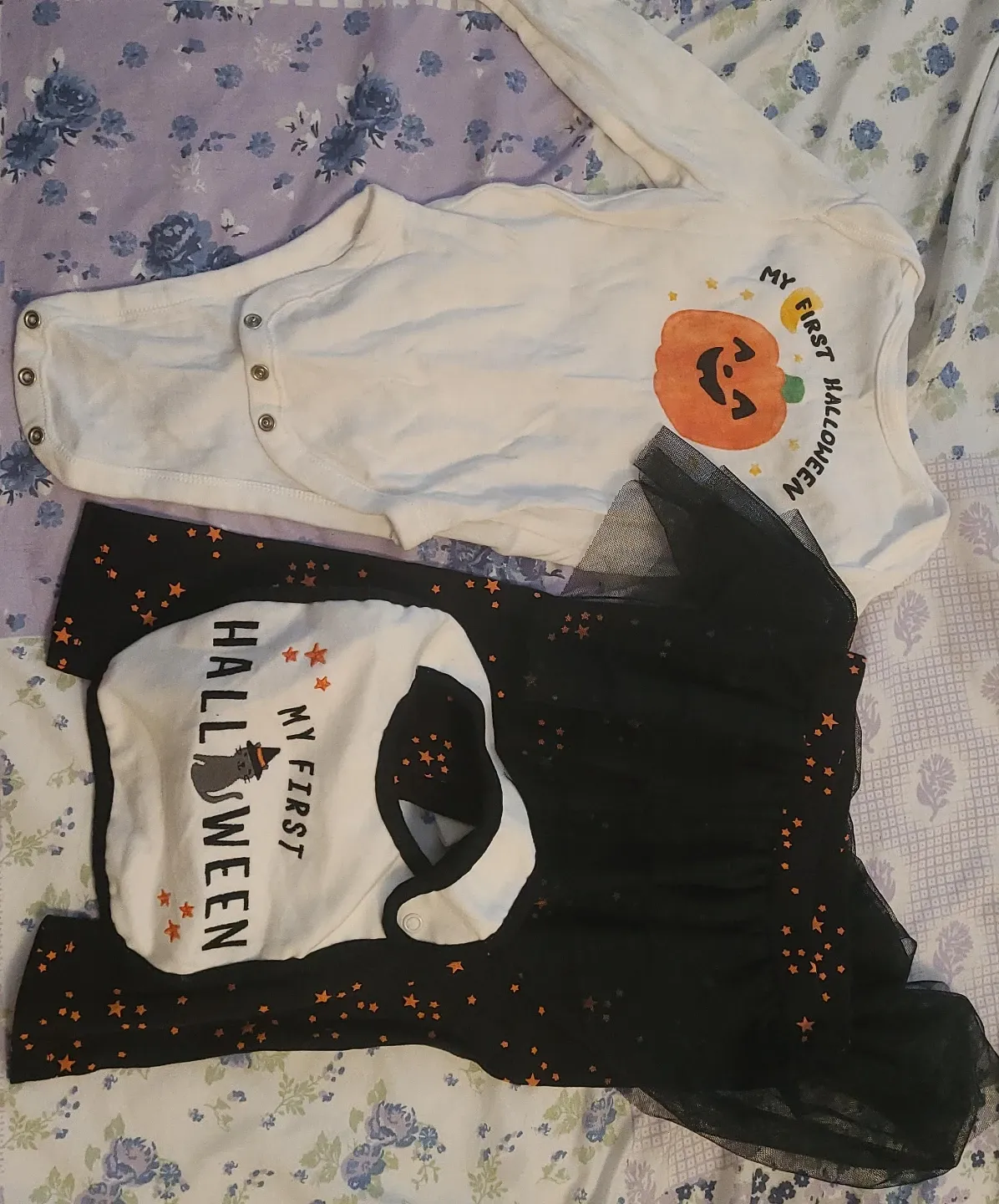 Get your little one ready for their first Halloween with this adorable outfit set! It includes a onesie with a cute pumpkin design, a bib, and a black skirt with orange star accents. Perfect for those first Halloween photos! It is washed and never worn. 12-18 months.