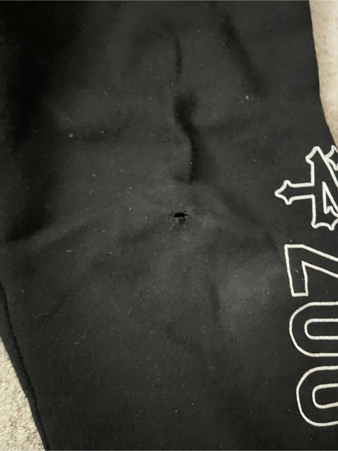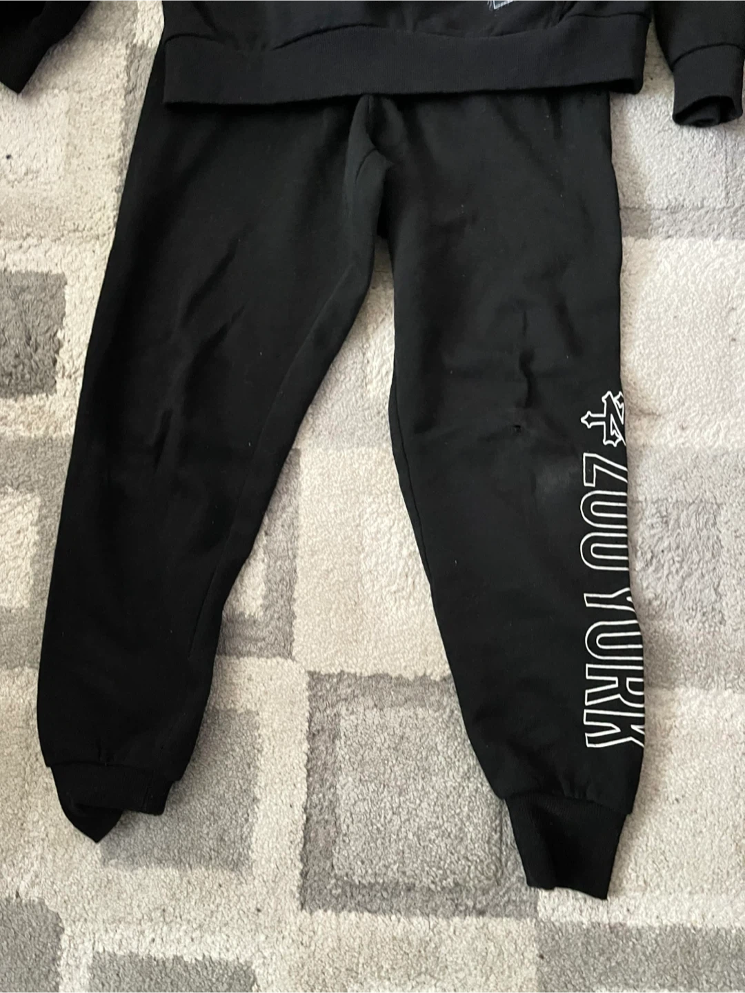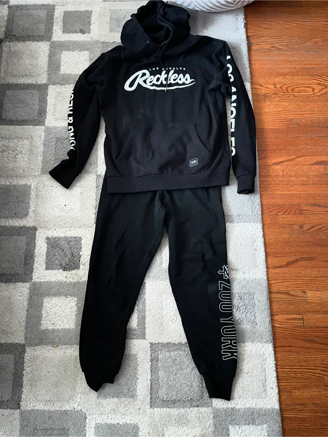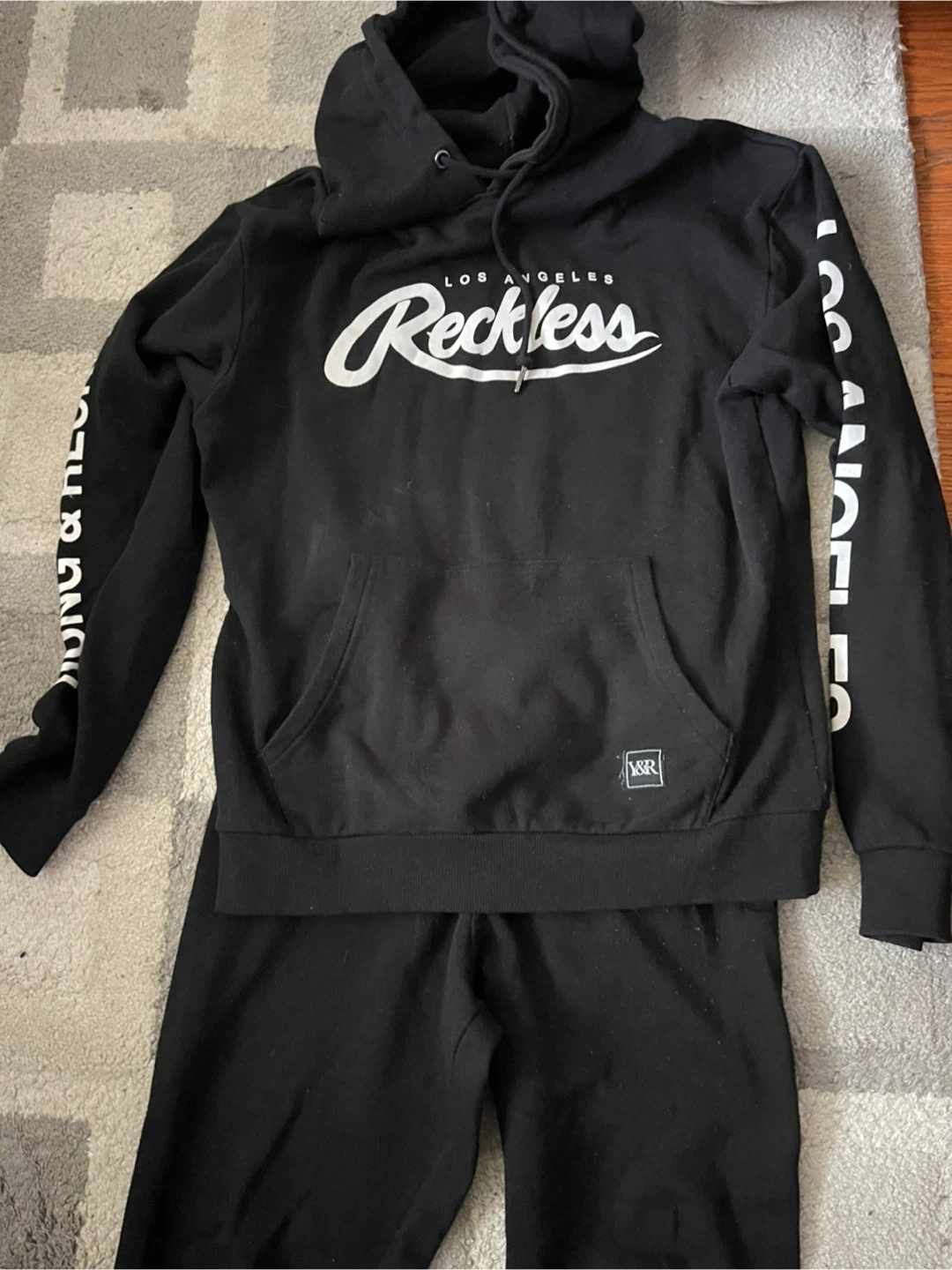 Selling a Young & Reckless hoodie paired with Zoo York pants. The set is black and features the brand names printed in white. There is a small hole on the pants.