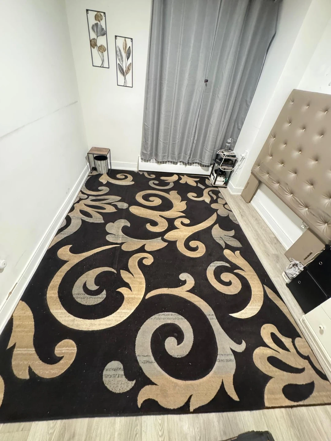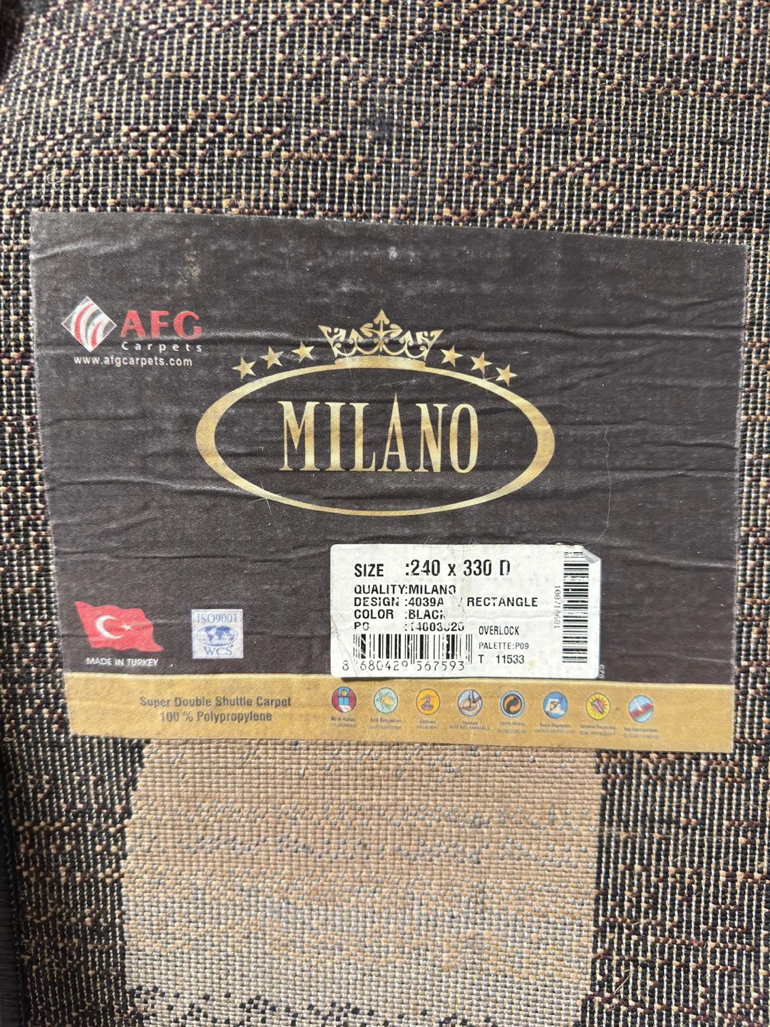 Selling a beautiful AEG Carpets Milano rug. It's a super double shuttle carpet made of 100% polypropylene. The size is 240 x 330 cm and the color is black. It's in great condition and would look lovely in any room!