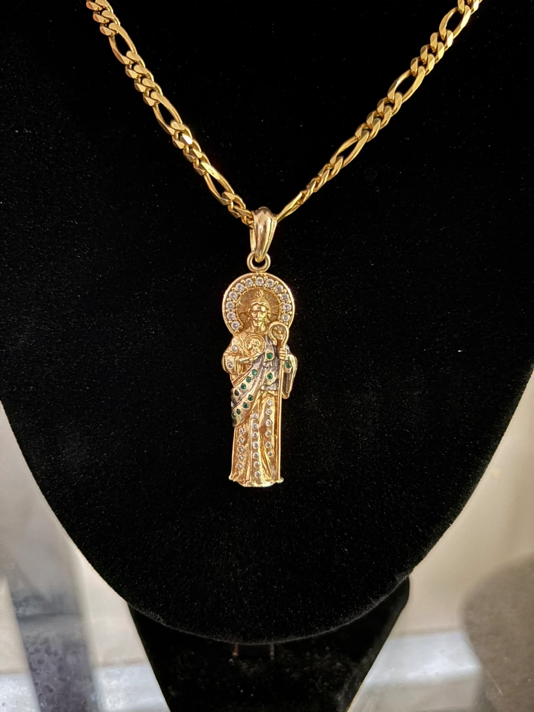 Beautiful charm by San Judas Tadeo, made of solid gold of 10 carats, with fine details and inlaid stones that highlight its elegance, as seen in the image.