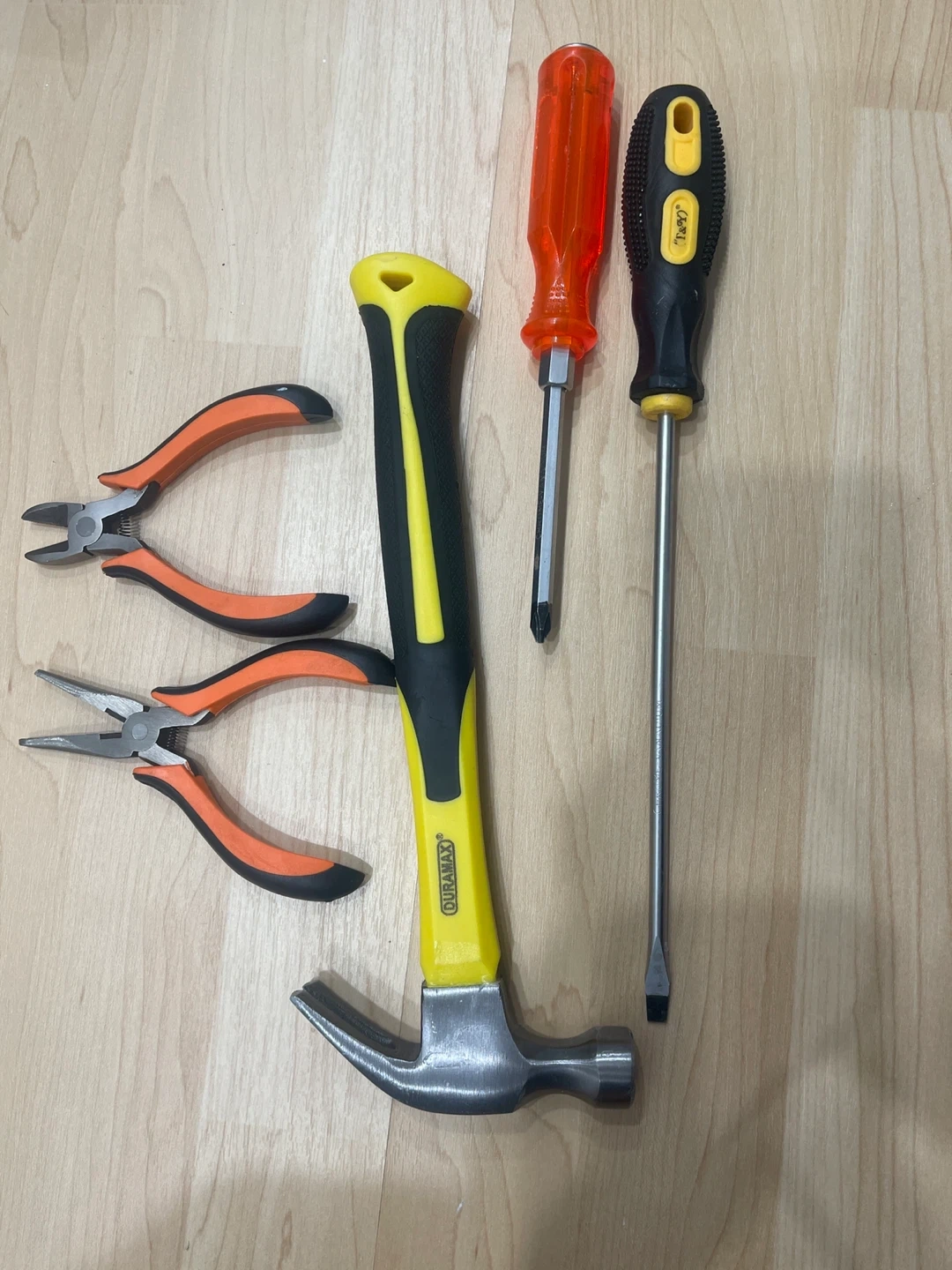 Selling a set of tools including a Duramax hammer, a pair of orange and black pliers, an orange handled screwdriver, and a black and yellow handled screwdriver