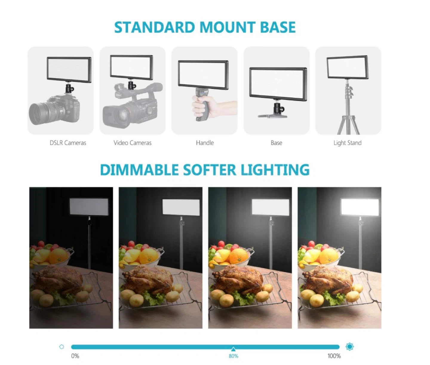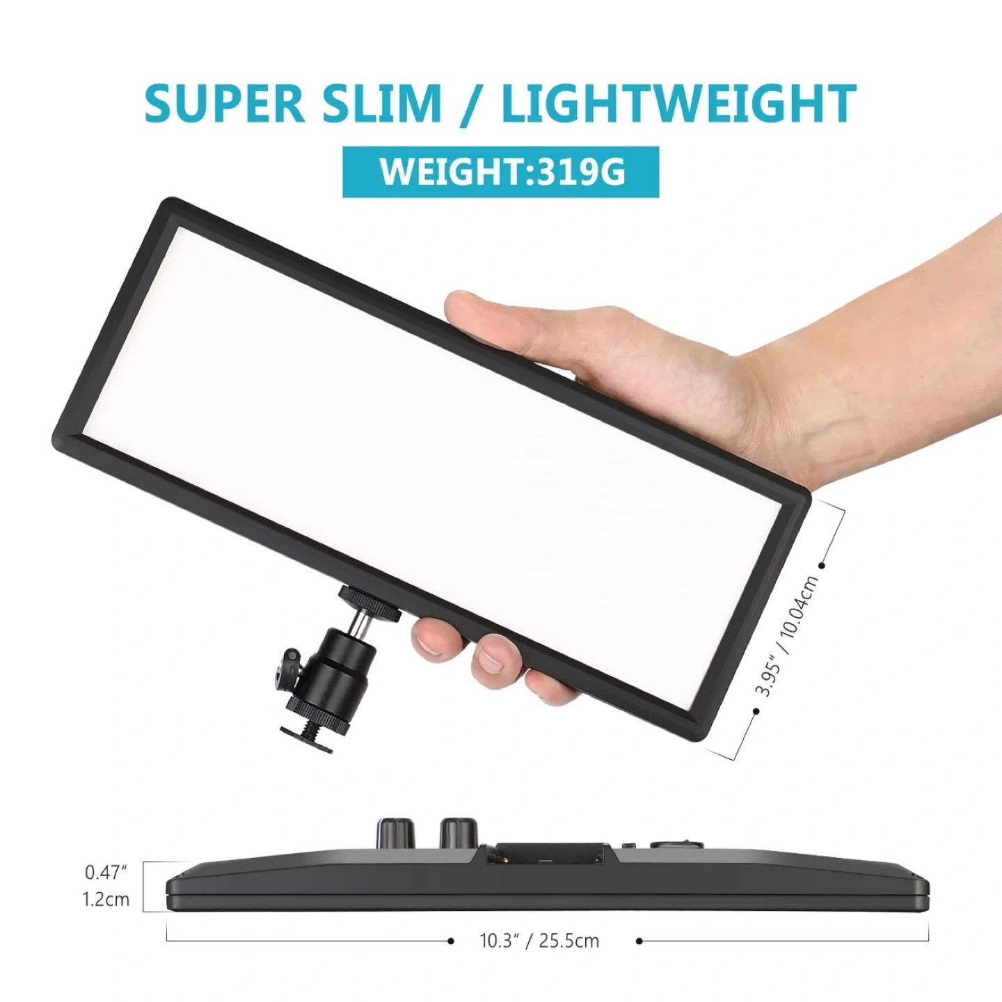 Slim, lightweight, dimmable LED panel with adjustable color temperature.