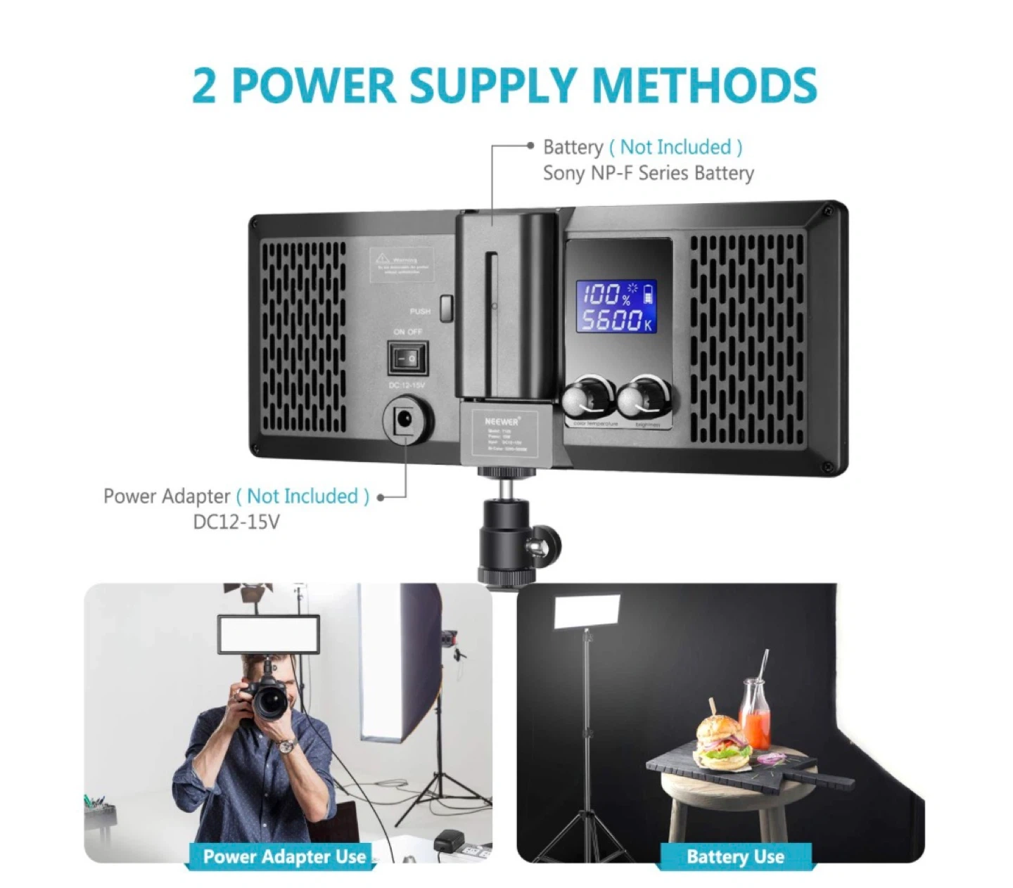 Works with Sony NP-F series batteries or DC power (adapter not included).