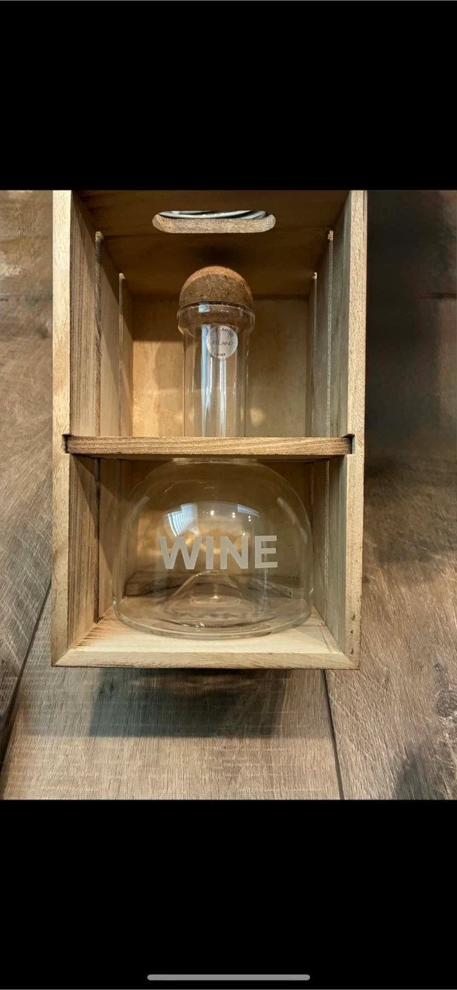 Wine carafe set in a wooden box! The set includes a glass carafe with 'WINE' etched on the front container with a cork lid. Perfect for serving wine or other beverages in style