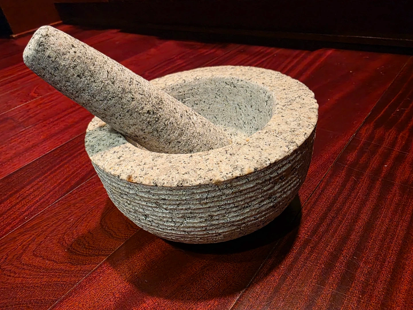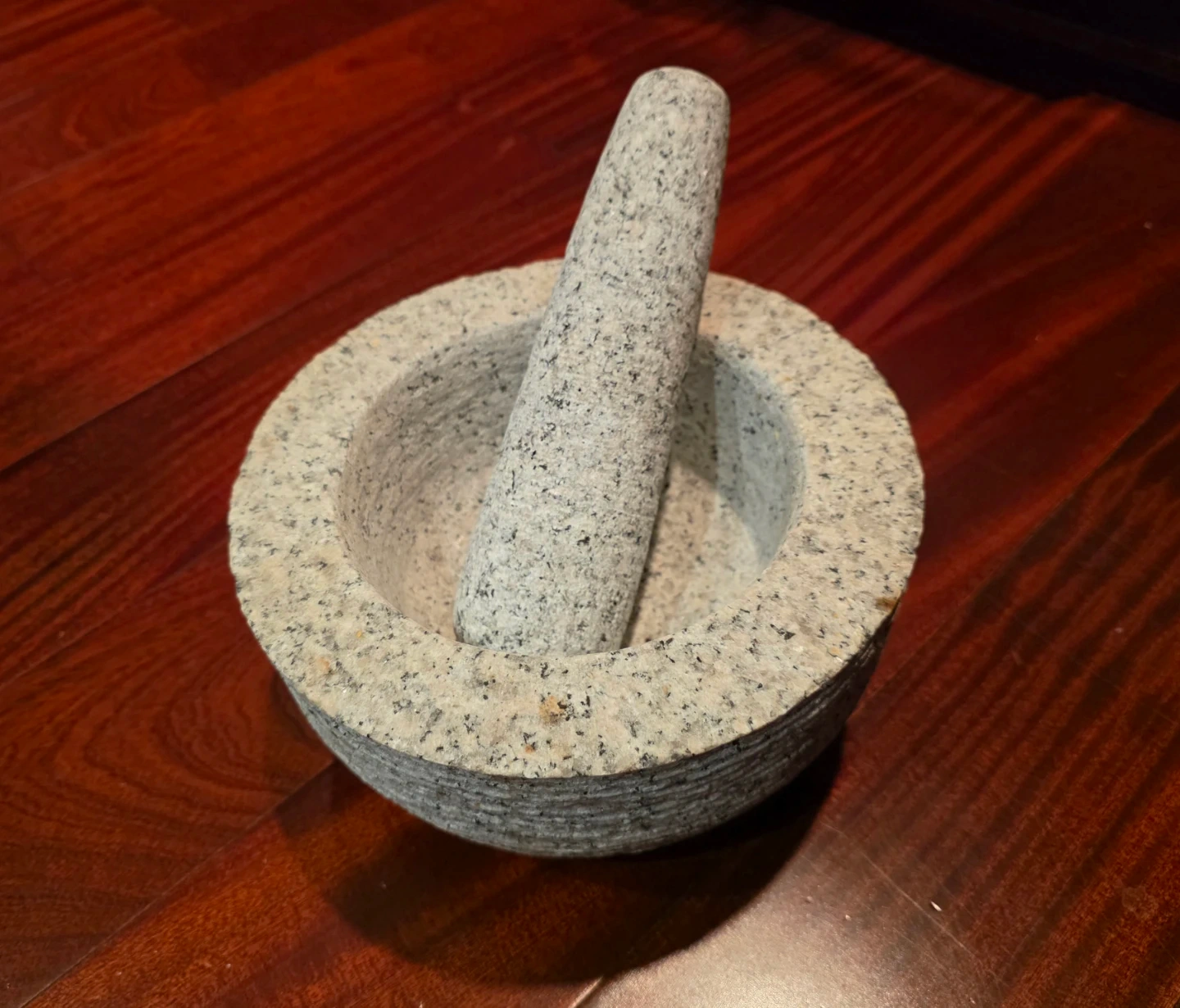 Heavy-duty granite mortar and pestle in excellent condition. Ideal for grinding spices, herbs, garlic, and making pastes. Durable, stable, and easy to clean.