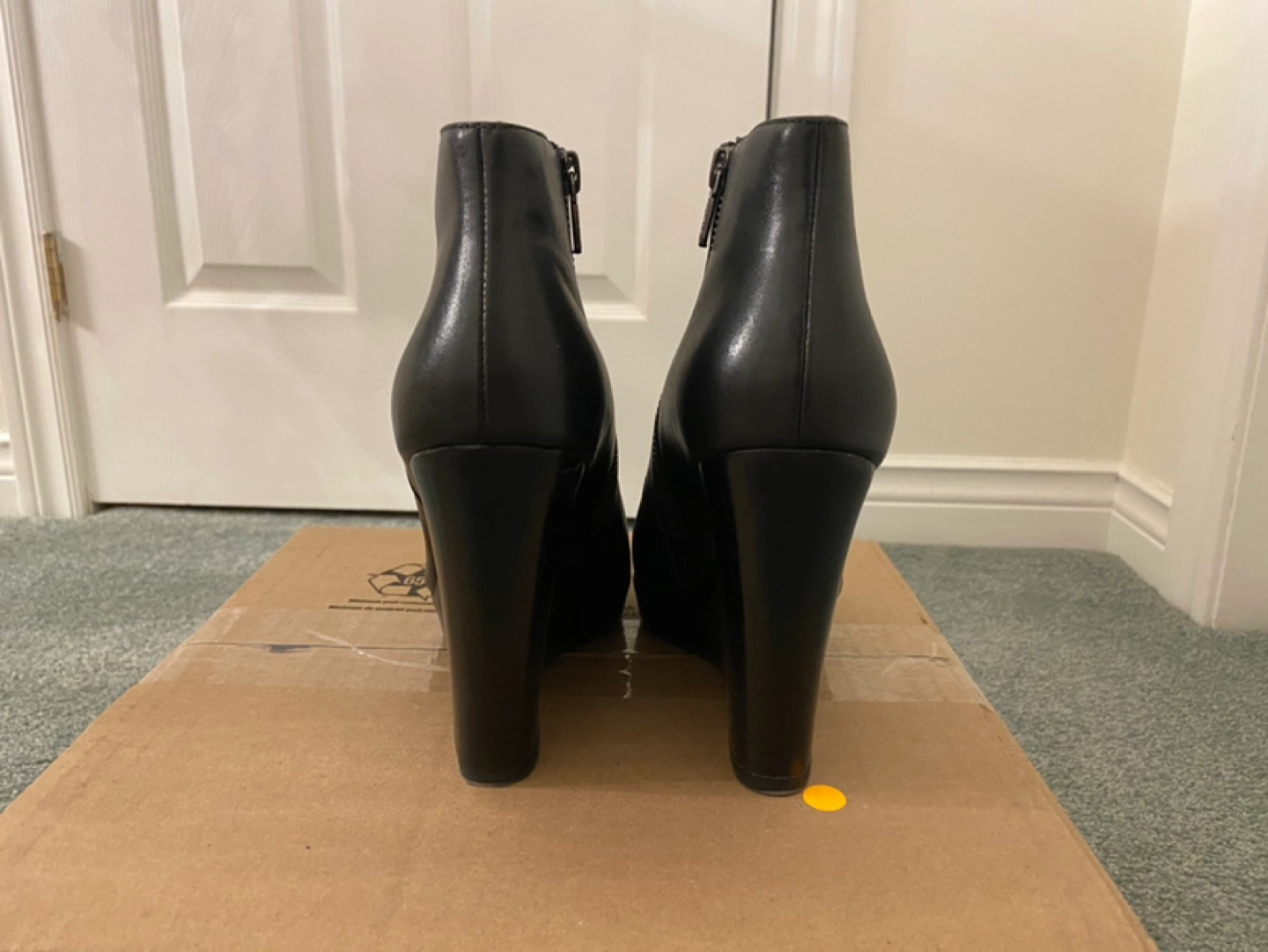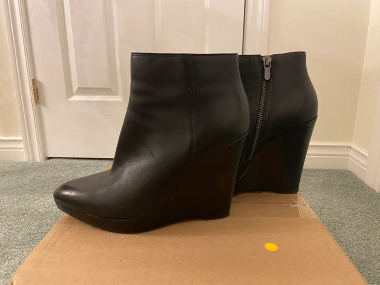 Excellent, like new condition Michael Kors Black Leather Wedge Booties. Selling only because they're half a size too small for me, otherwise comfortable to stand and walk in.