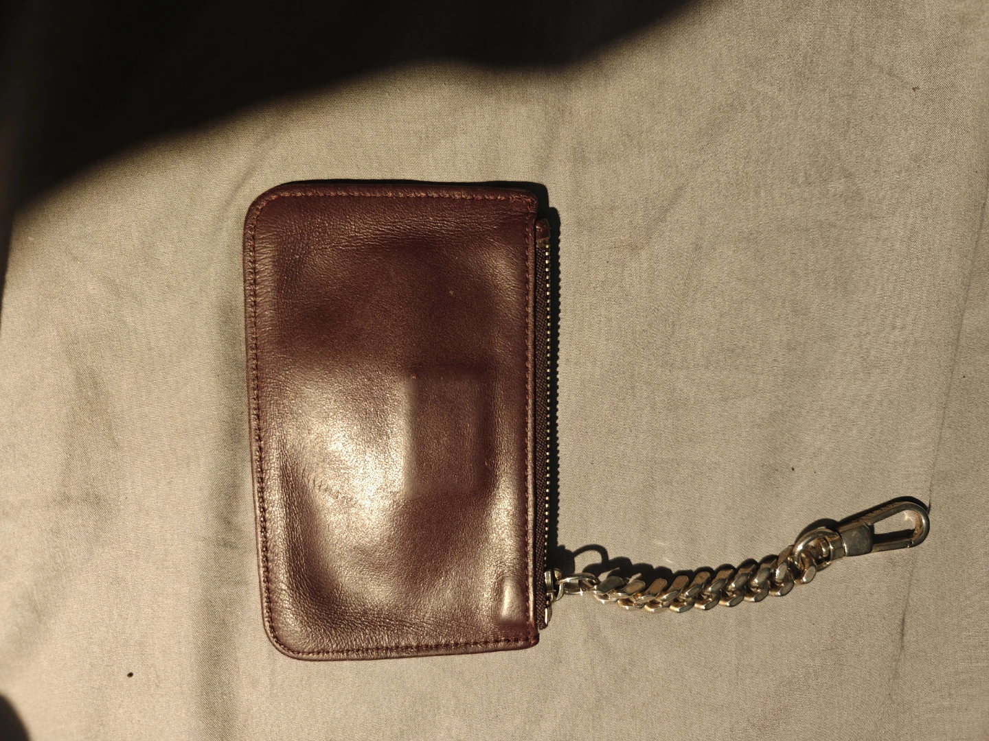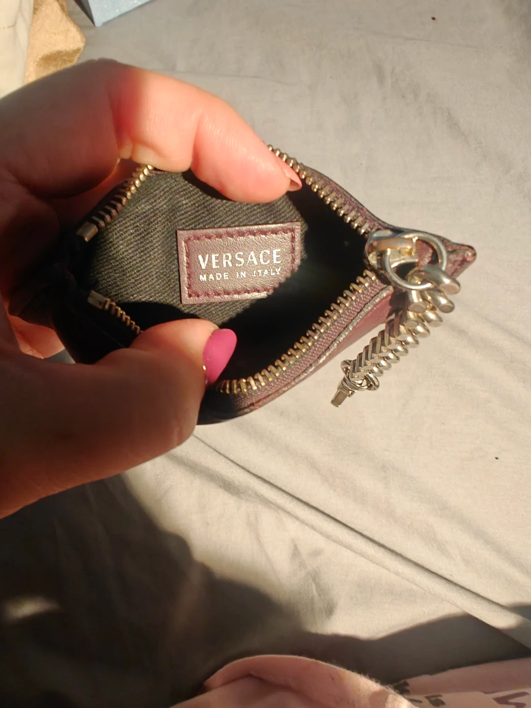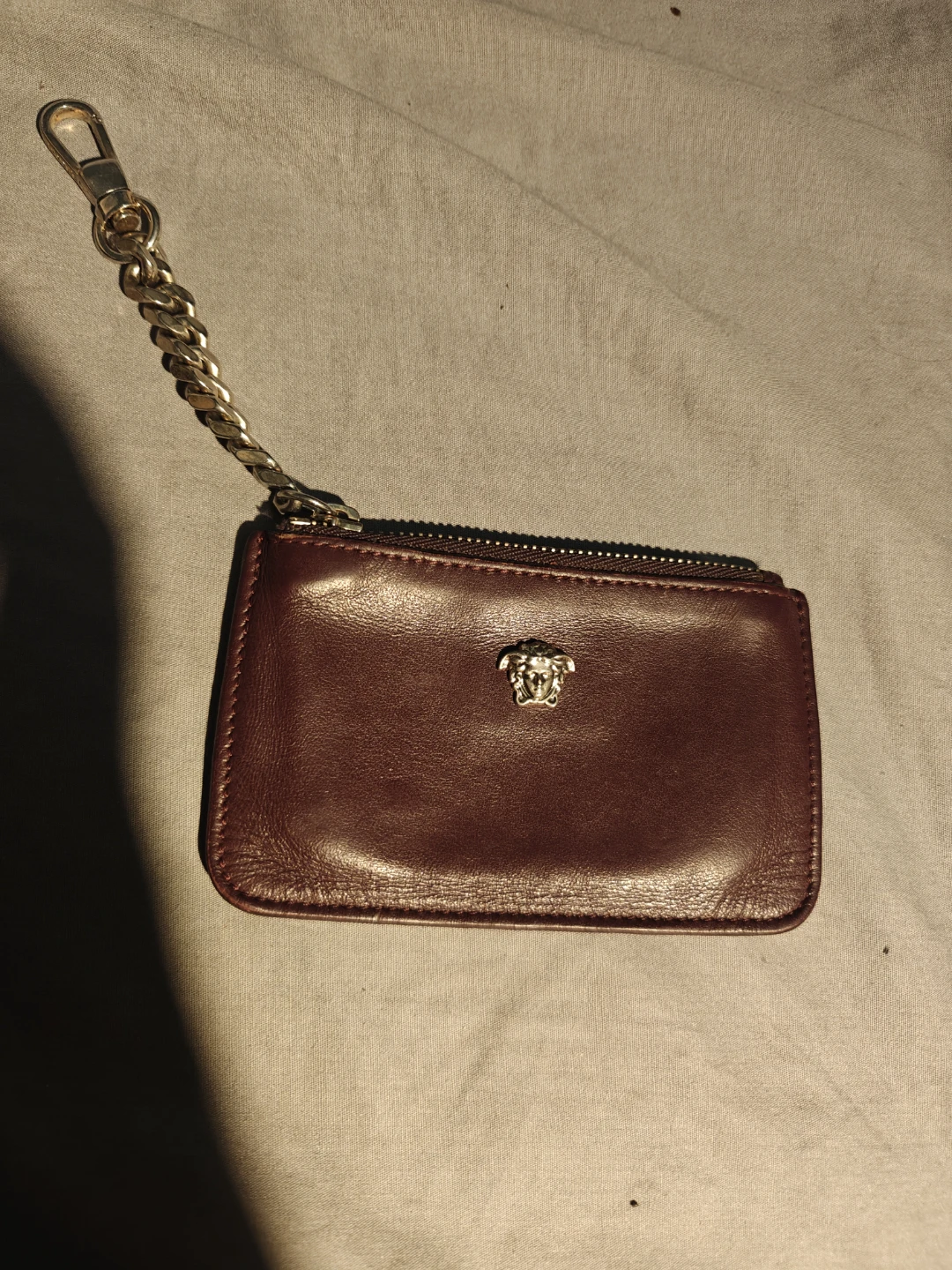 Selling a stylish Versace card holder. It's made of leather and features a chain. The colour is a lovely dark brown. Perfect for carrying your cards in style!