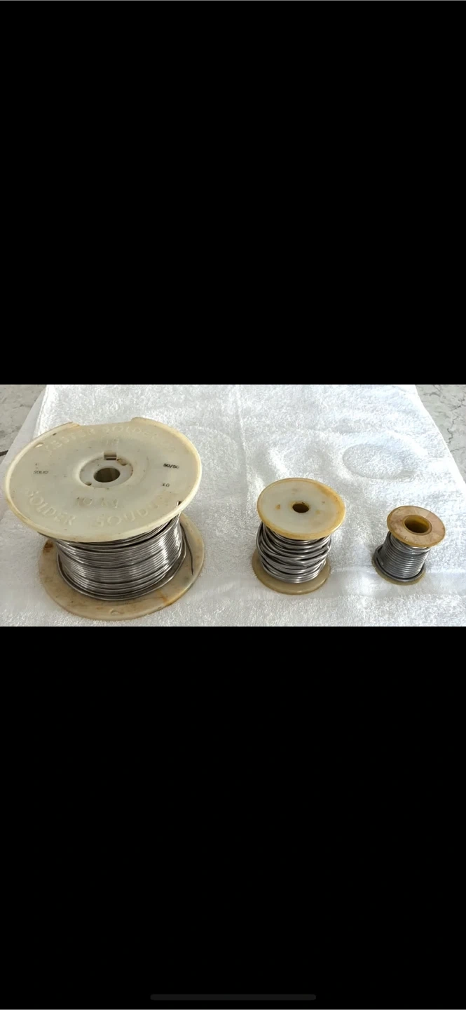 Selling a set of three vintage 50/50 Kester solder spools. They come in different sizes, perfect for various soldering projects. In total there is 16 pounds.