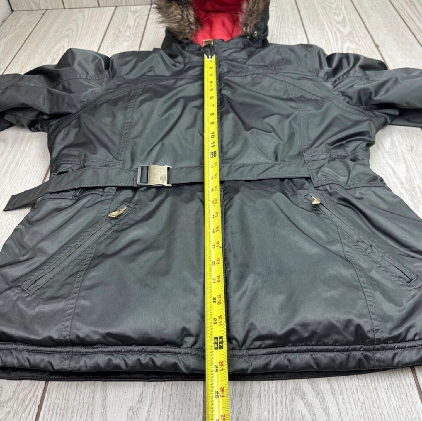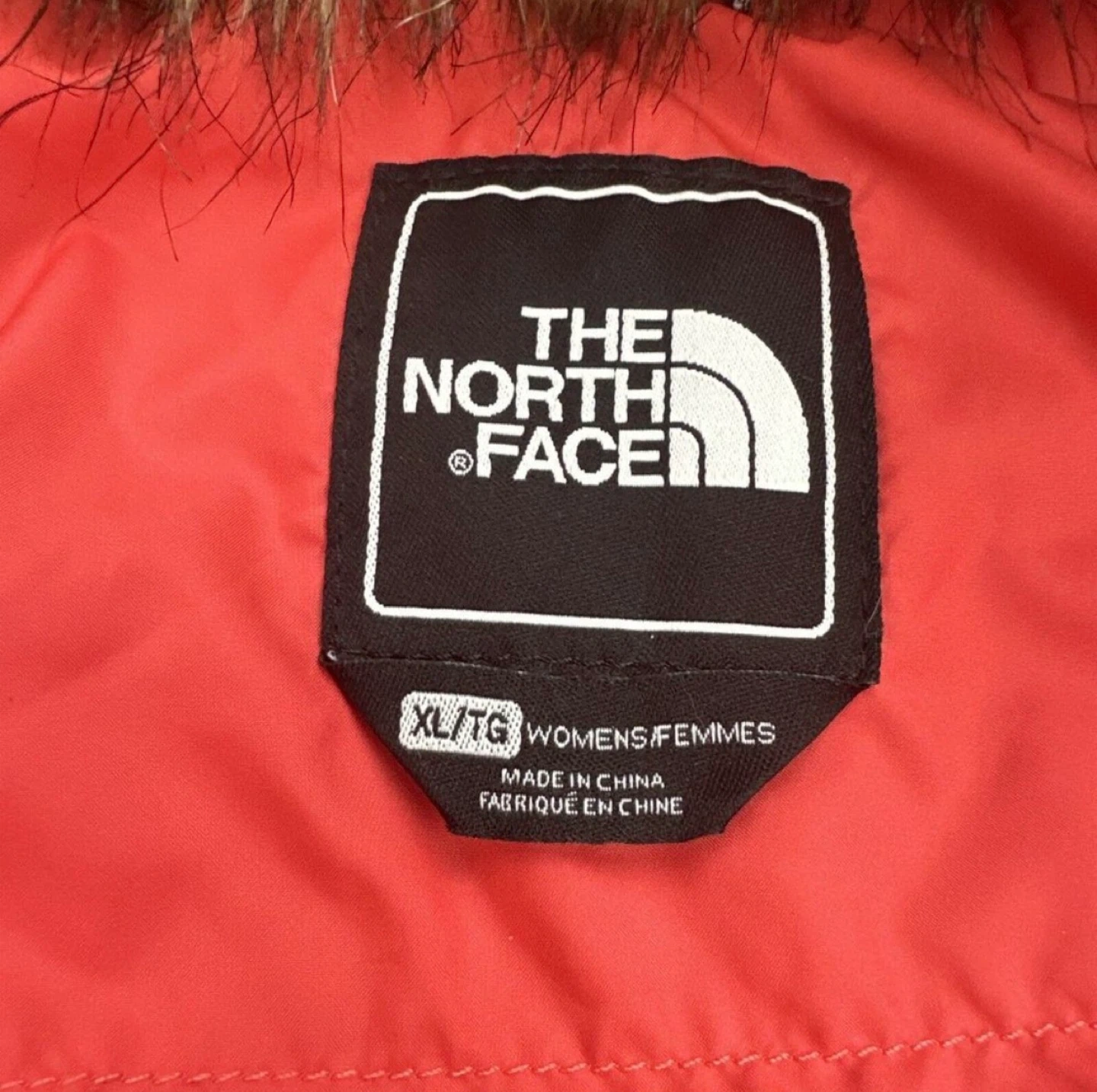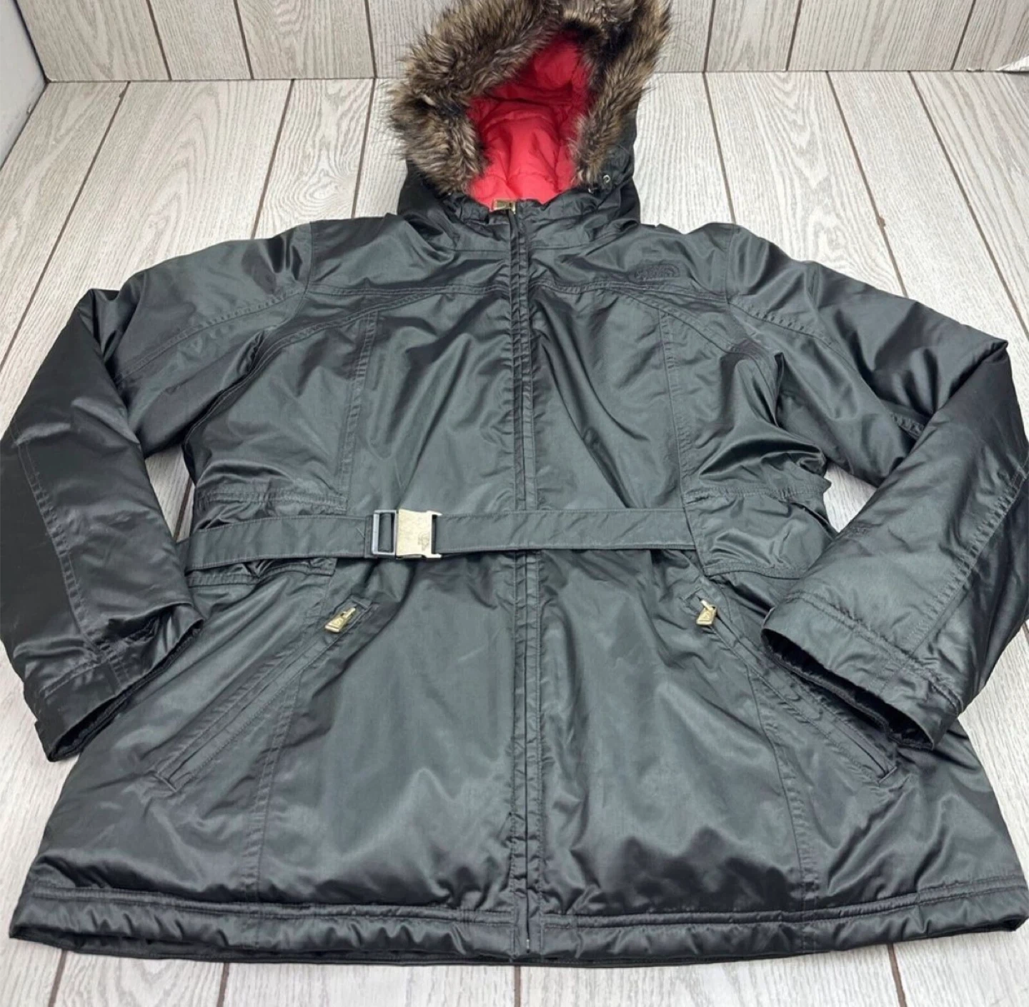 Selling a women's The North Face jacket in size XL/TG. It's olive green with an orange interior. It has a faux fur hood trim and a belted waist. Has been dry cleaned.