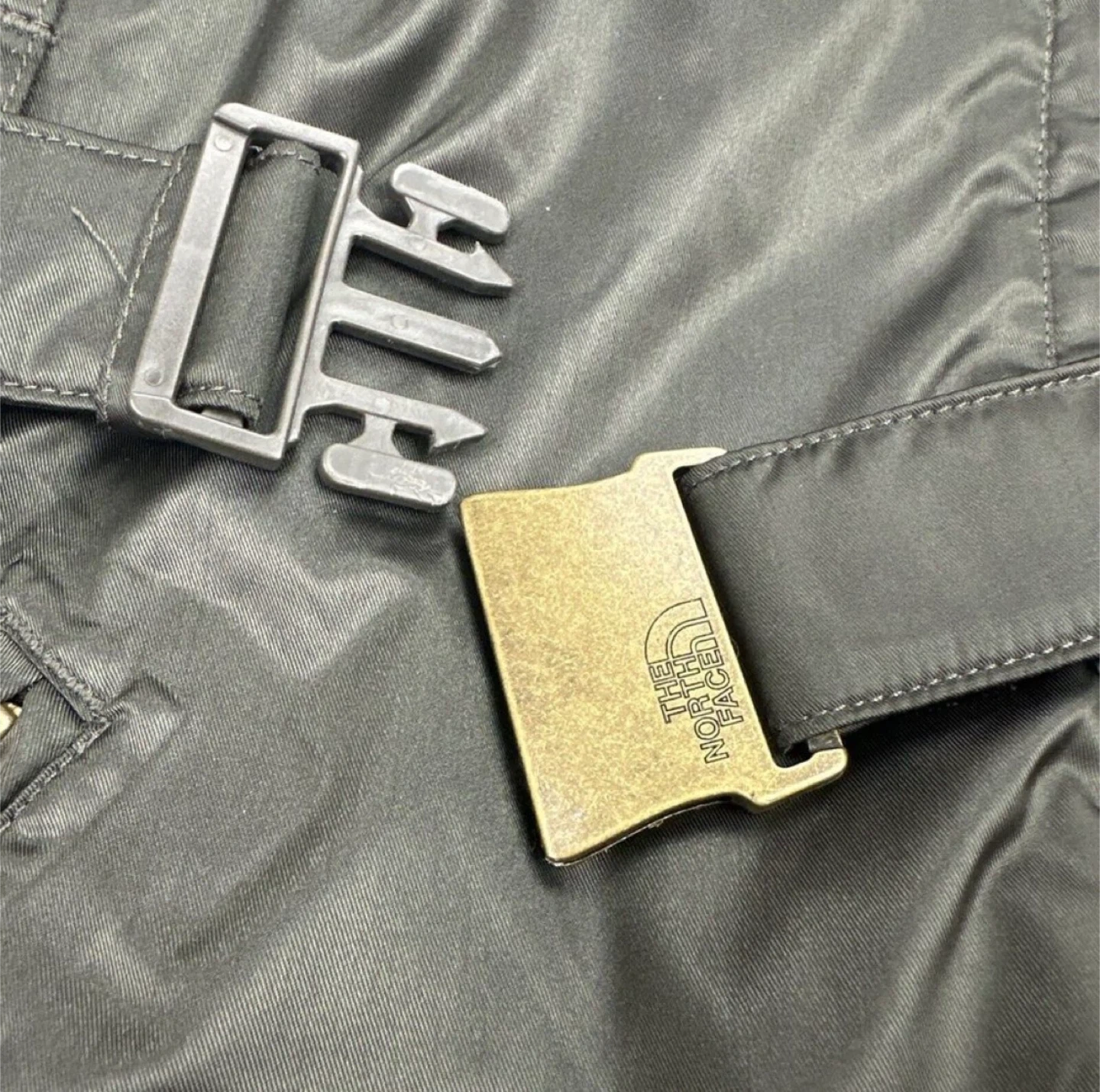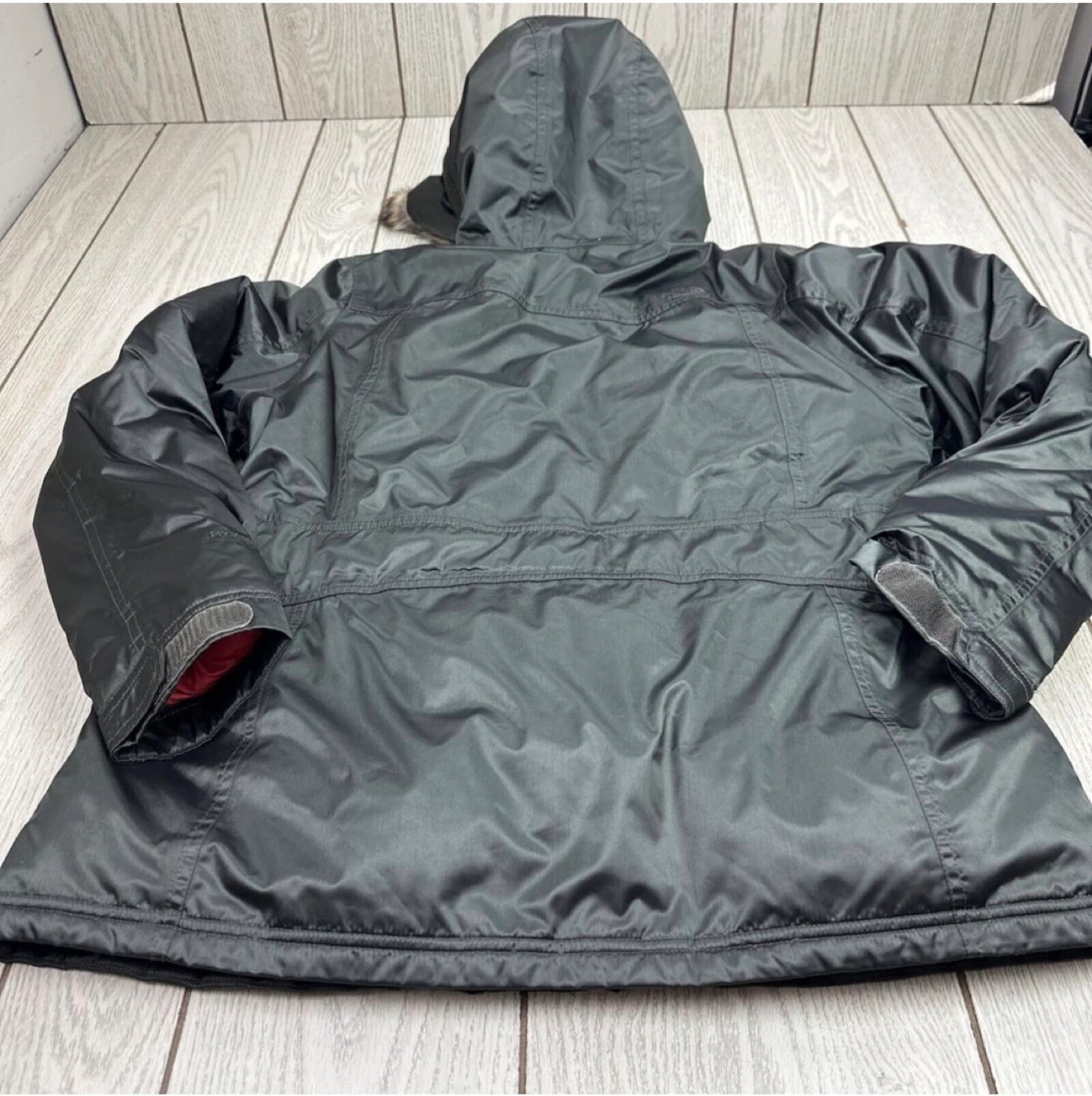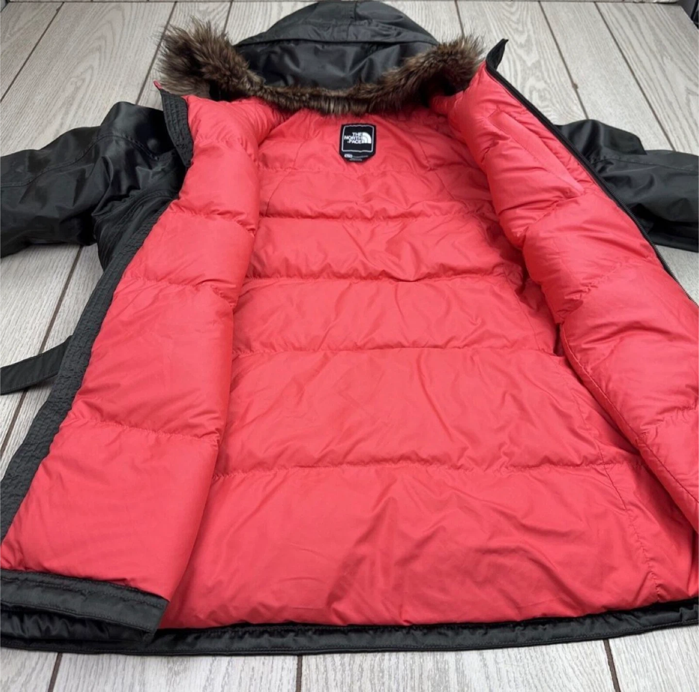 Selling a women's The North Face jacket in size XL/TG. It's olive green with an orange interior. It has a faux fur hood trim and a belted waist. Has been dry cleaned.