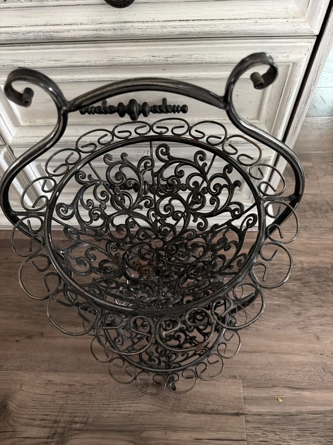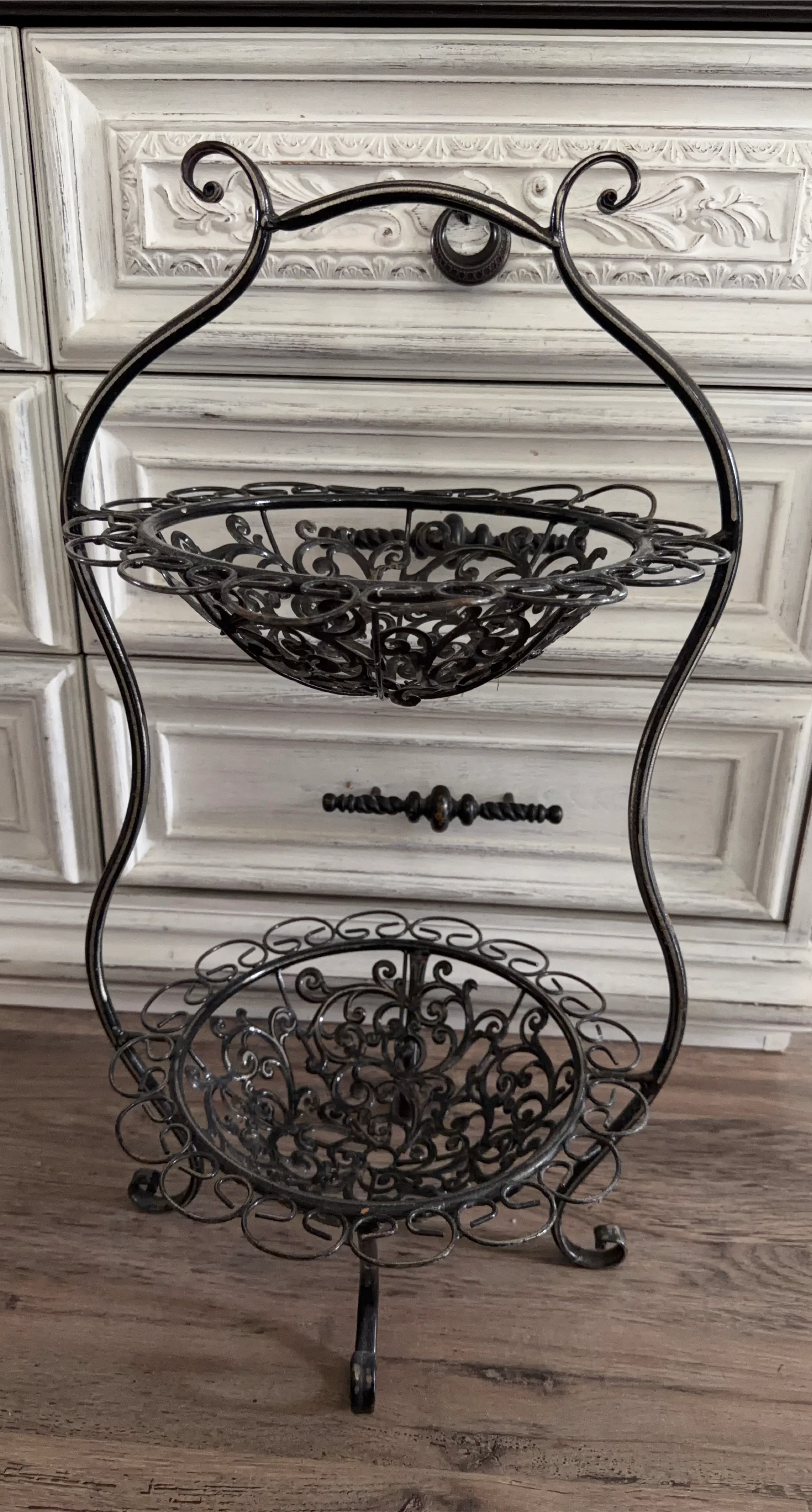 Add a touch of elegance to your home with this decorative two-tiered metal stand! It's perfect for displaying fruits, desserts, or decorative items. The stand features a beautiful ornate design and a sturdy metal construction. It's in great condition and ready to enhance your space