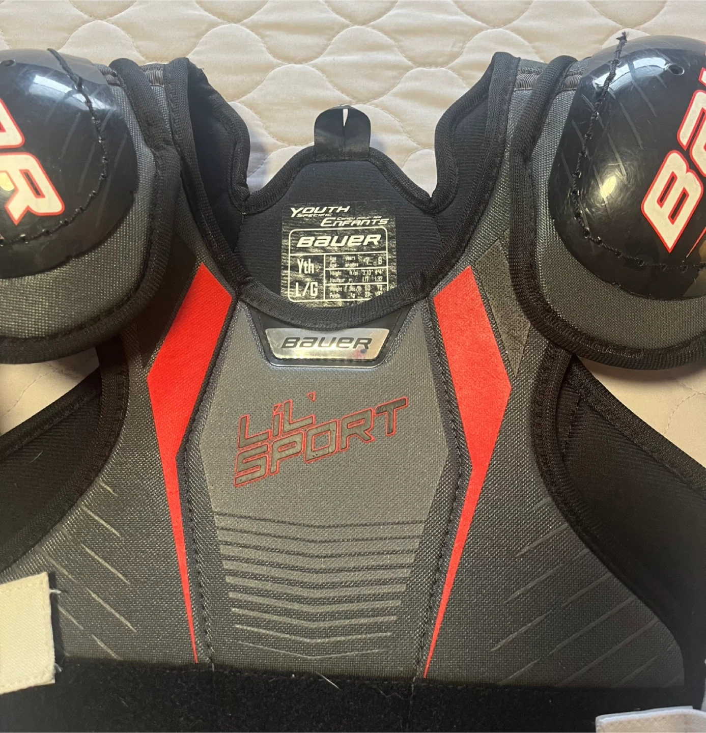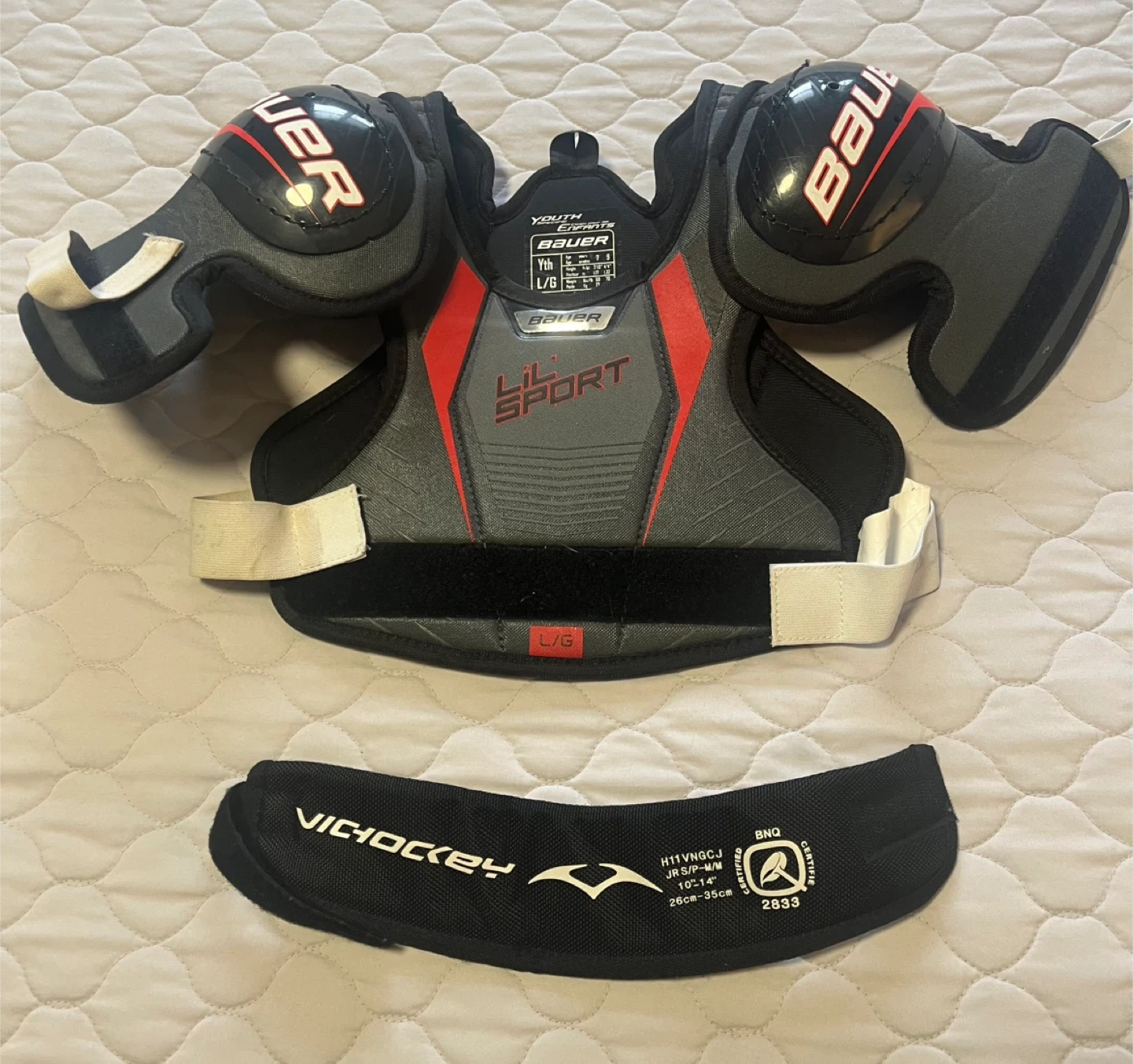 Bauer Lil Sport youth hockey shoulder pads in size Large. Also includes a VIC Hockey neck guard, size Junior Small/Medium, fitting neck sizes 10"-14" (26cm-35cm)