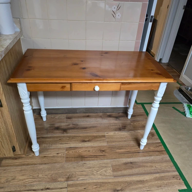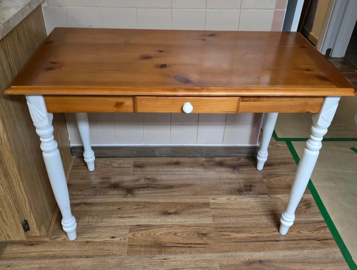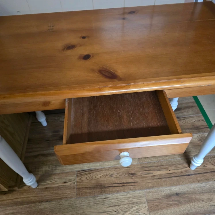 Selling a lovely pine wood desk! It features a natural wood top and stylish white legs. There's also a handy little drawer for storage. Perfect for a home office or study space