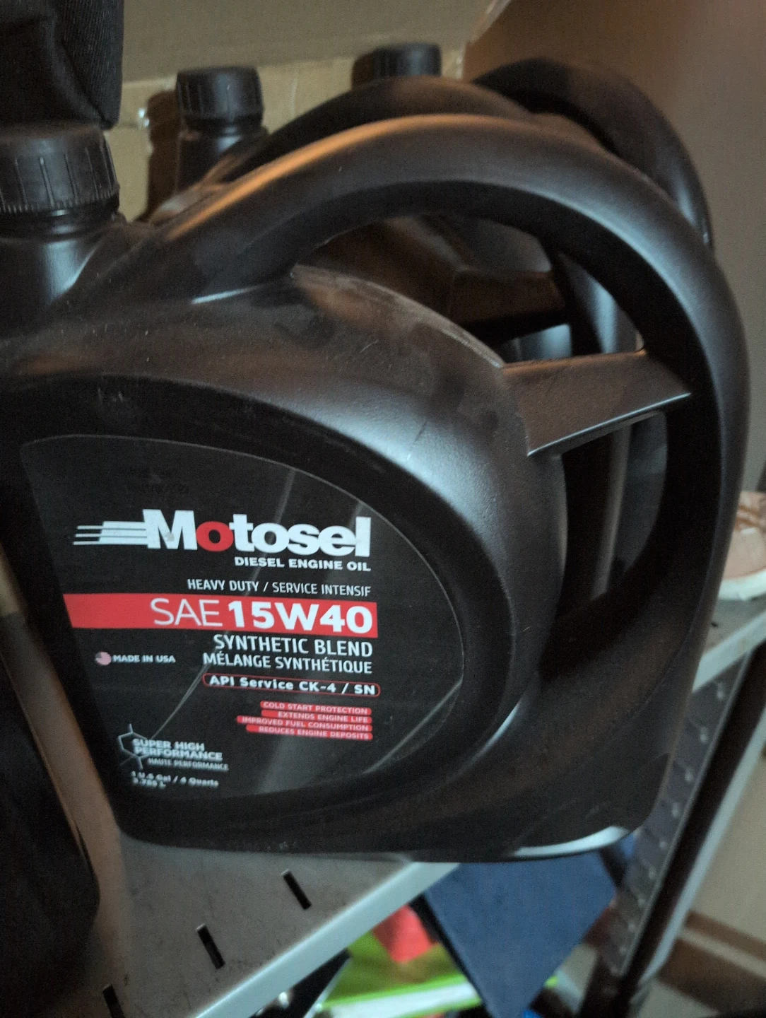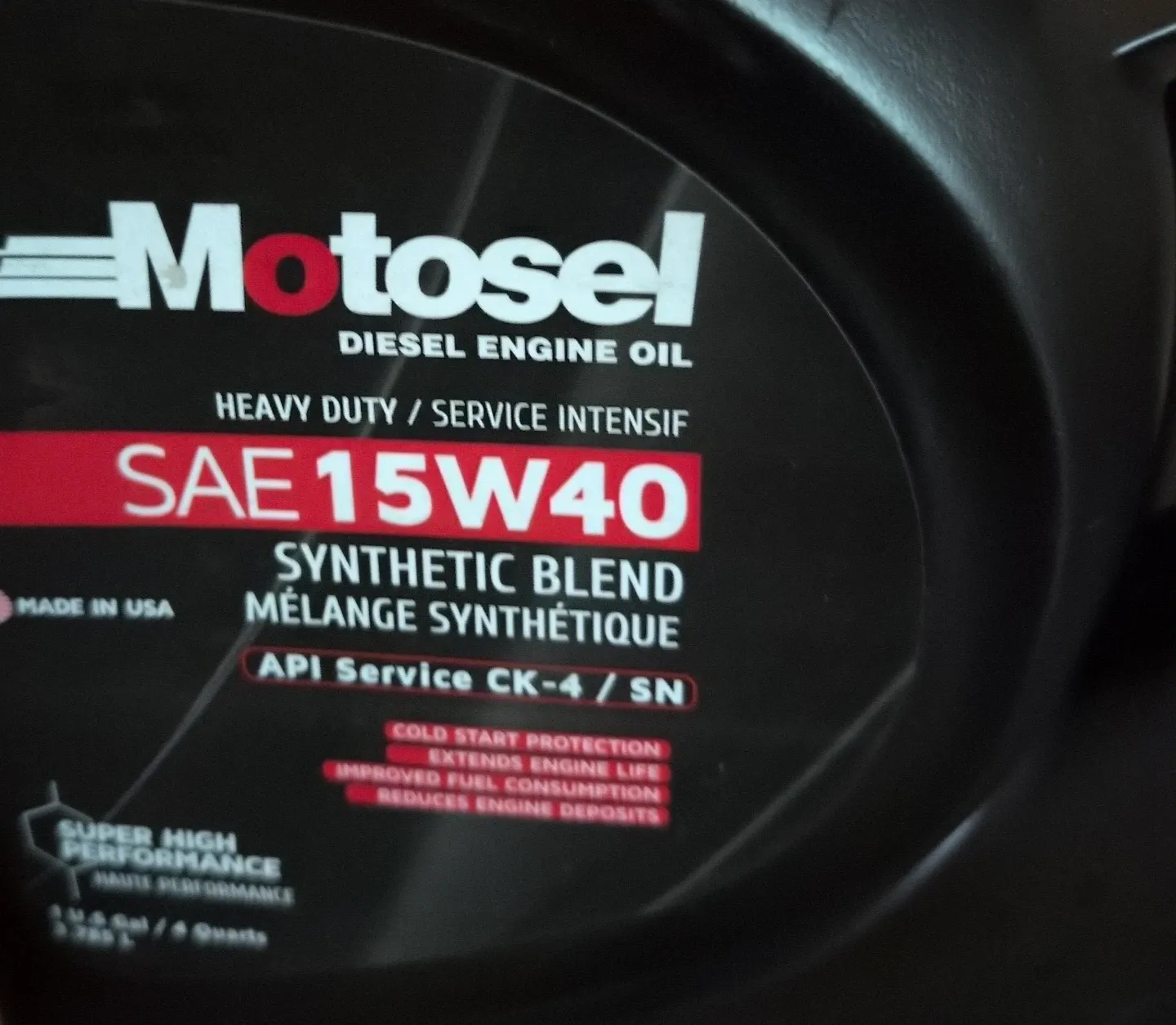 Selling a jug of Motosel SAE 15W40 heavy duty diesel engine oil. It's a synthetic blend that provides cold start protection and extends engine life. It also improves fuel consumption and reduces engine deposits