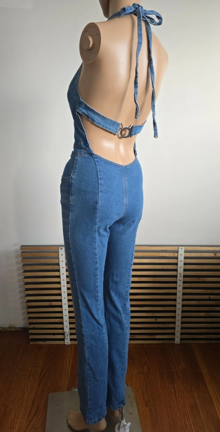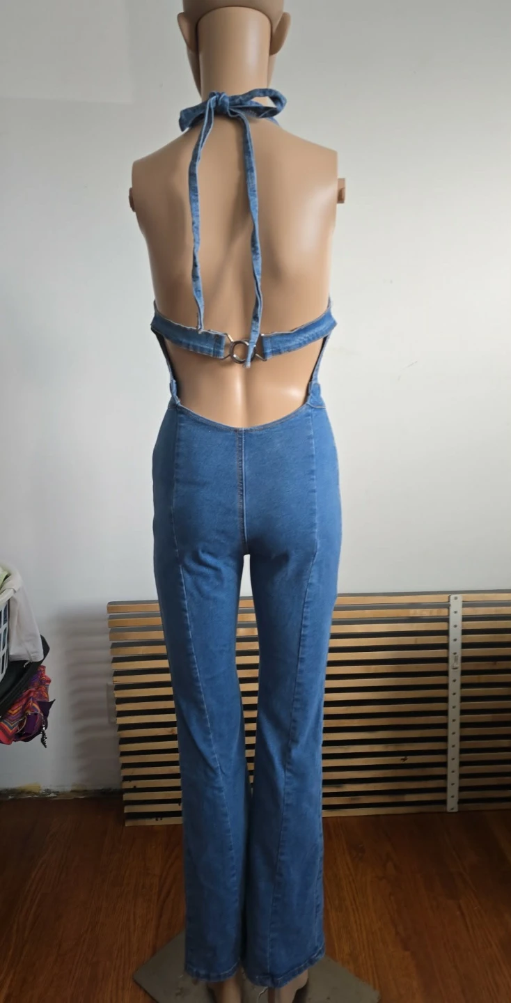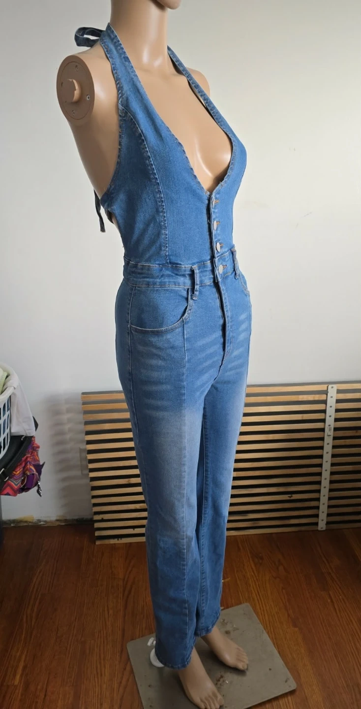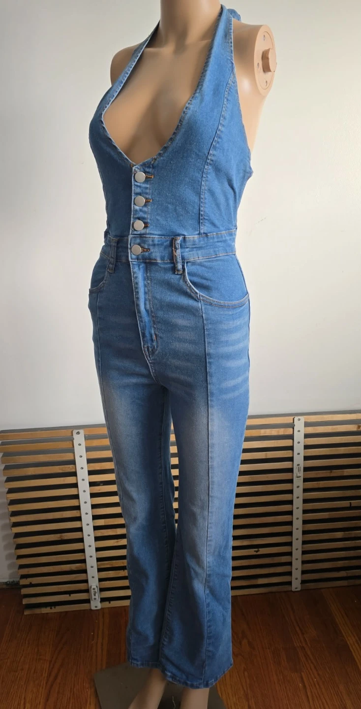 Denim halter jumpsuit! It features a4way stretch denim for a super comfy flattering fit with a halter neckline with a tie closure, a button-up front, and a flared leg. Perfect for a casual day out or a night on the town