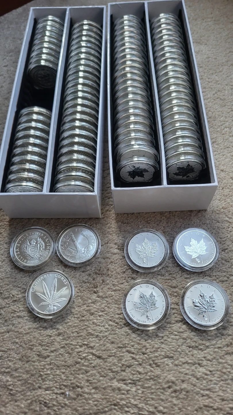 Selling a collection of silver coins, including Canadian Maple Leaf coins and others! They're in mint condition and come in protective cases and original boxes. Perfect for collectors or investors!