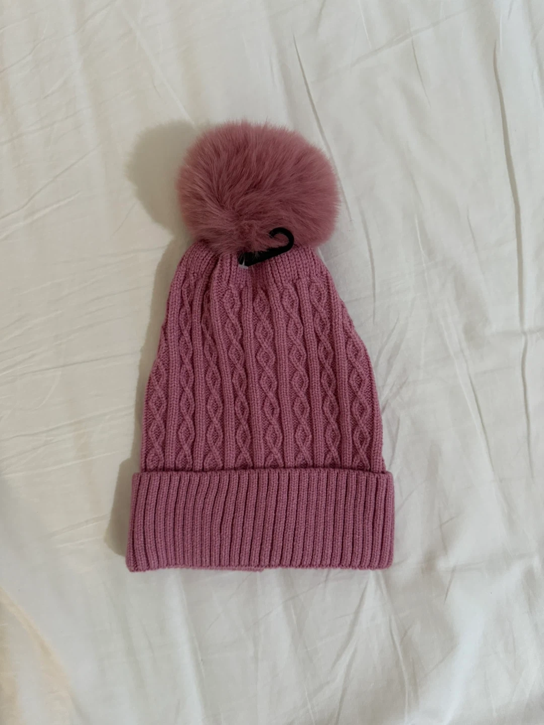 Selling a cute pink knit beanie with a fluffy pom pom on top!