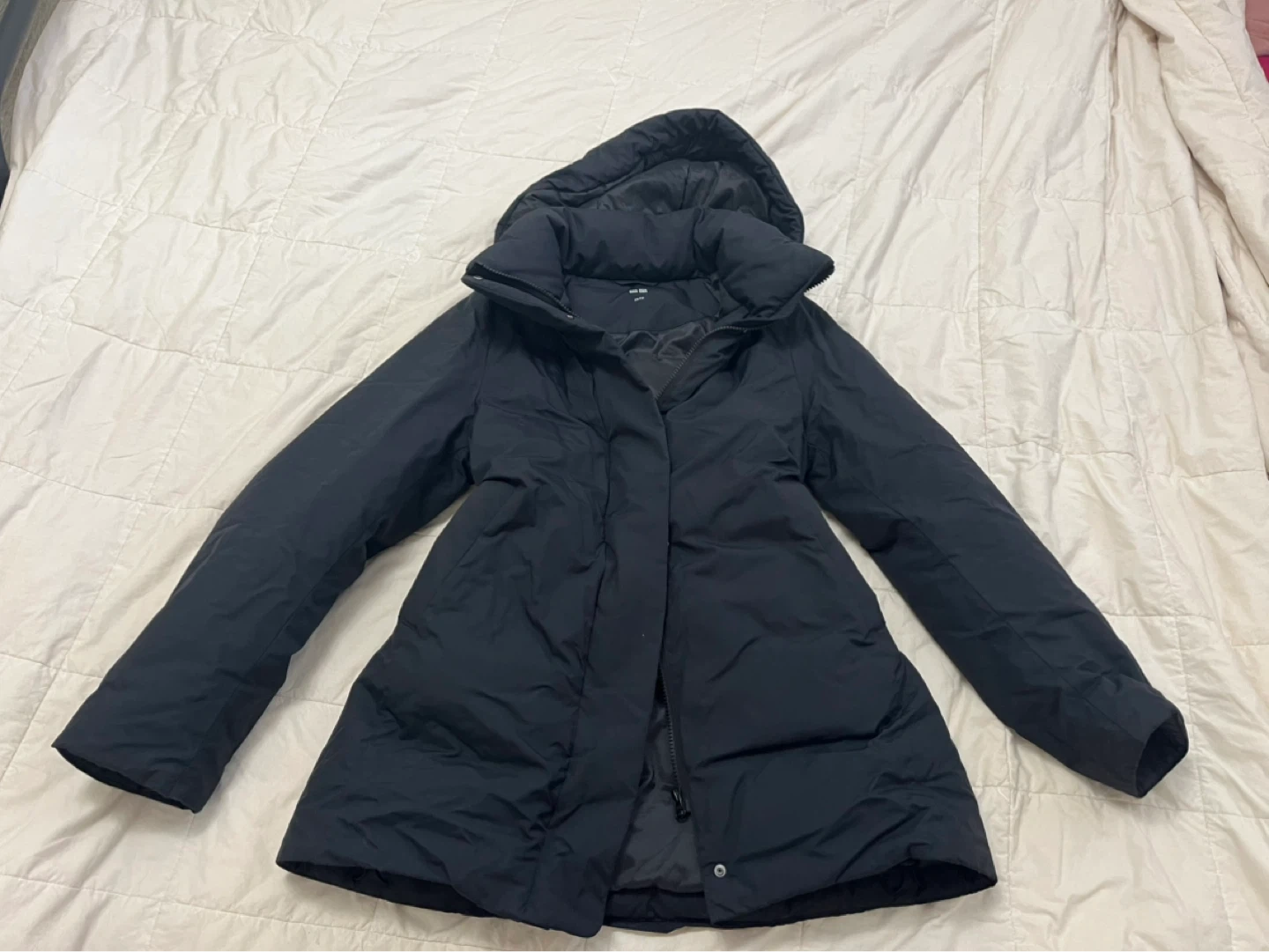 Selling a Uniqlo black down puffer coat. It's in great condition and super warm for the Canadian winter! Perfect for staying cozy while braving the cold weather.