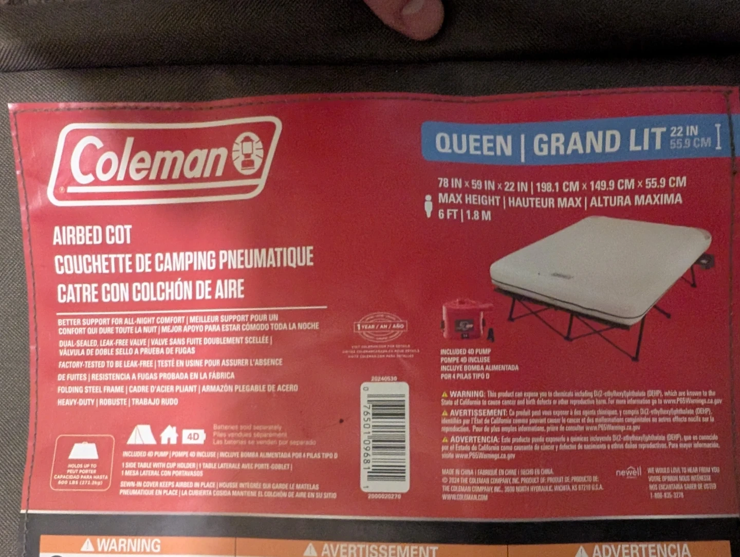 Selling a Coleman queen-sized airbed cot! It's in great shape and ready for your next camping adventure or guest room setup.