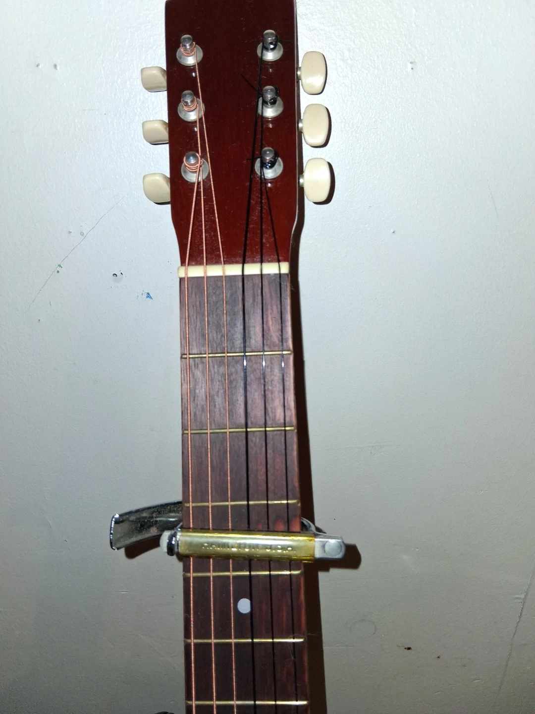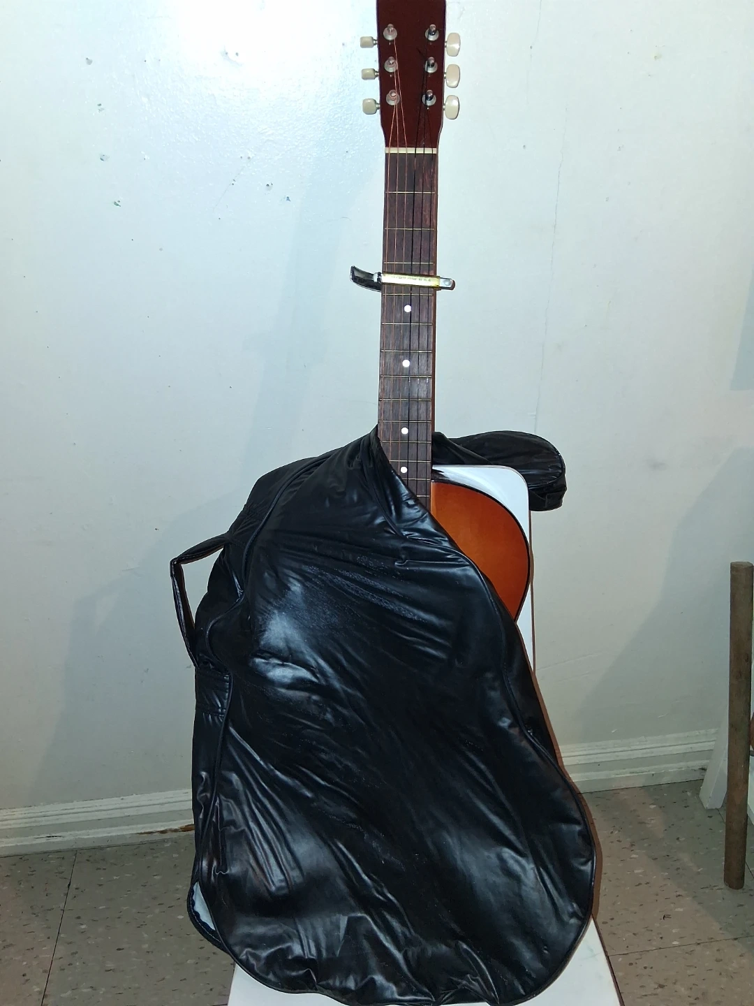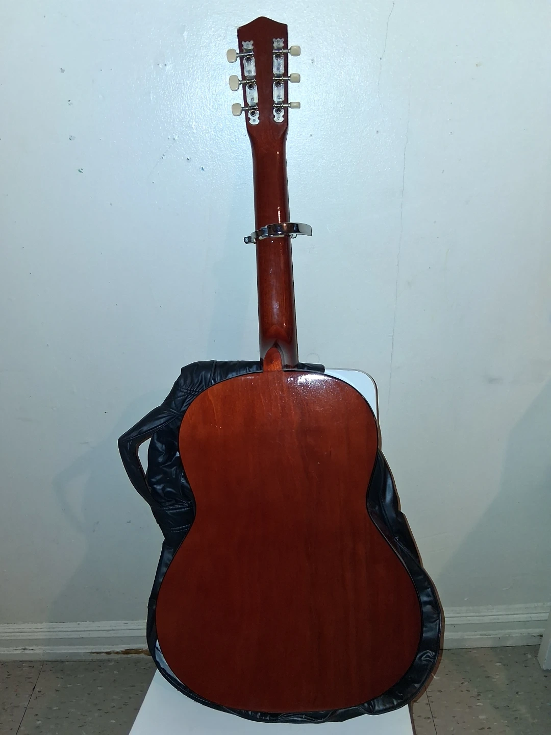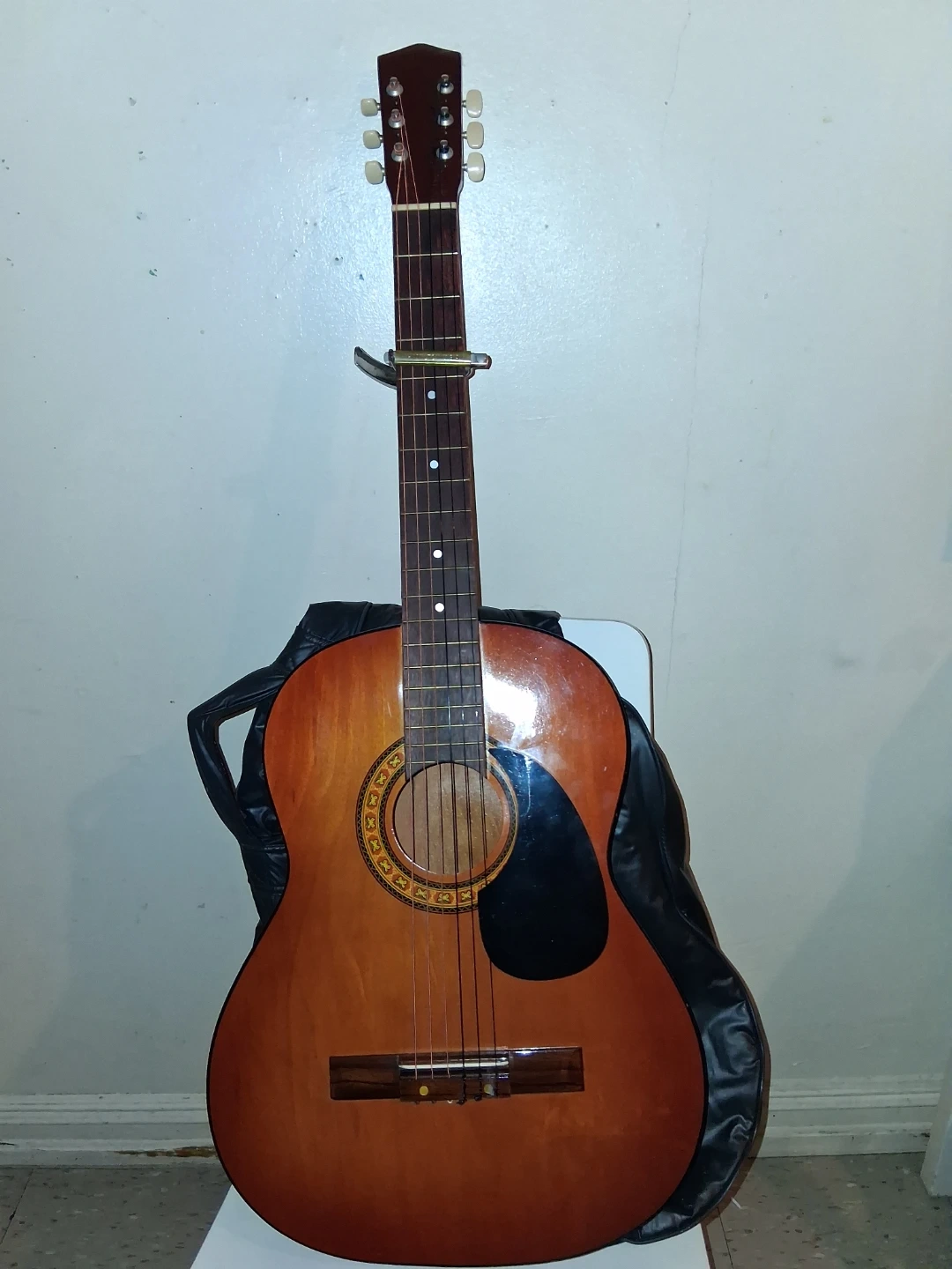 Selling a used acoustic guitar. It comes with a case for easy transport and storage. It's in good condition and ready for someone to play!
