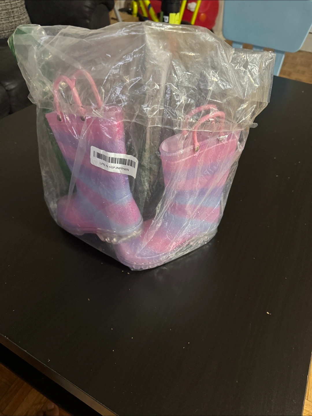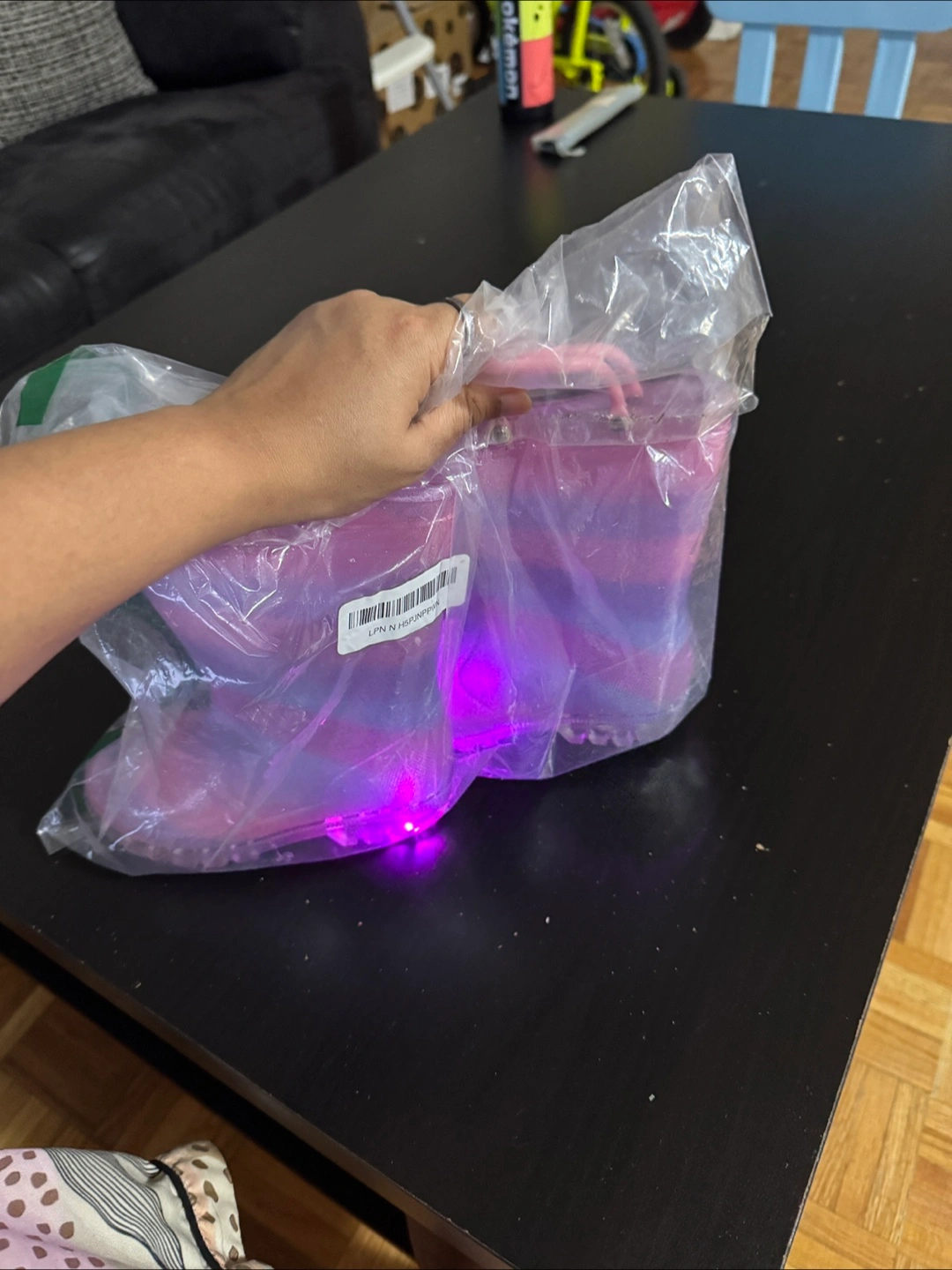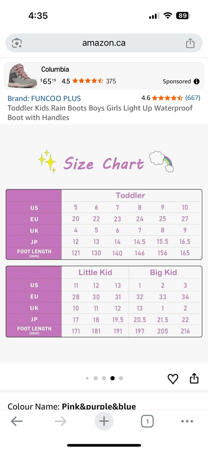 These adorable FUNCOO PLUS rain boots are perfect for your little one! They feature a fun light-up design and are waterproof, making them great for rainy days. The colour is a lovely pink, purple, and blue mix. According to the size chart, US size 9 for toddlers. They also have convenient handles for easy on and off!