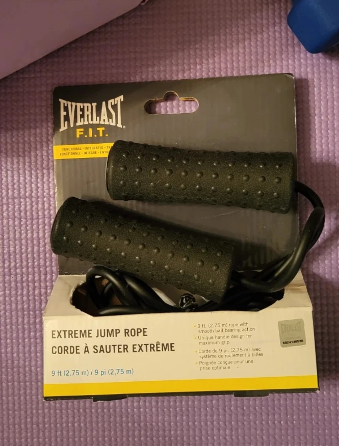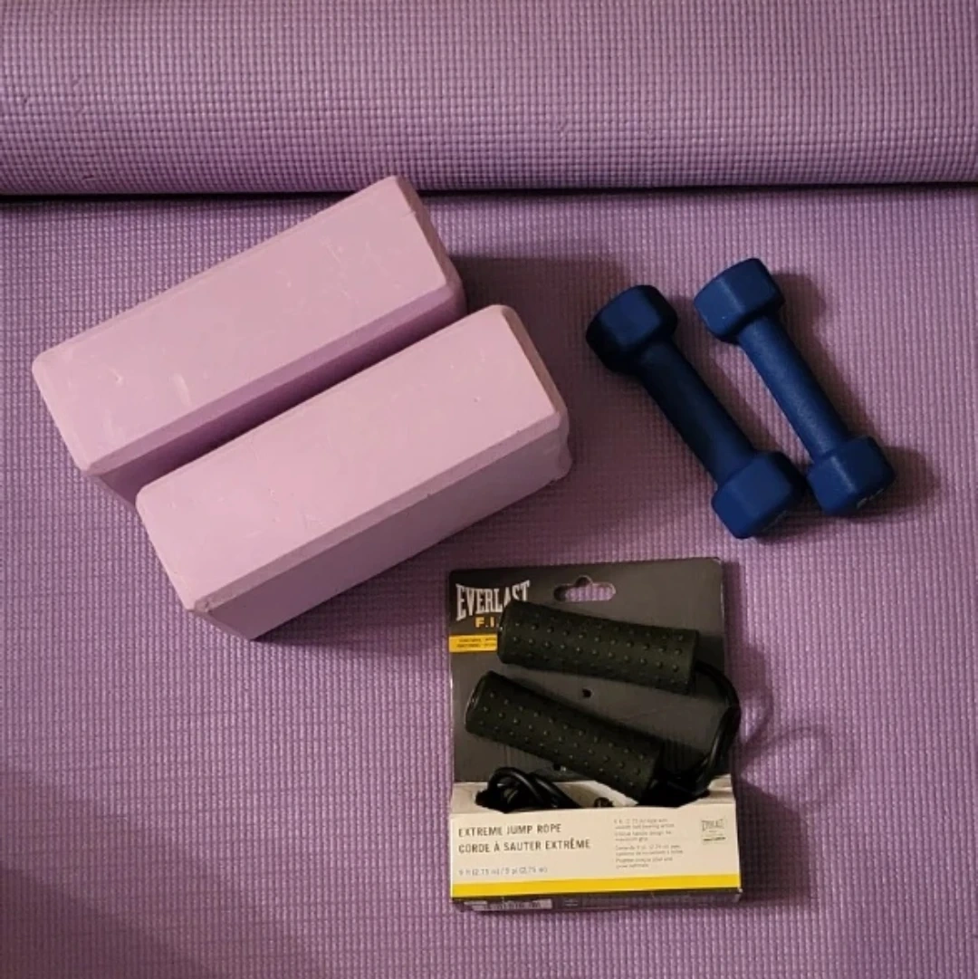 Selling a yoga Mat, set of 2 Everlast F.I.T. yoga blocks, an Everlast Extreme jump rope, and a pair of 2lb dumbbells. Perfect for starting or enhancing your home workout routine! The jump rope features a smooth ball bearing action and a unique handle design for maximum grip.