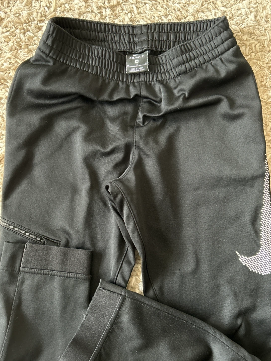 Selling a pair of Nike Dri-FIT pants in black, size medium! They feature the iconic Nike swoosh and a convenient zip pocket. These are great for workouts or just lounging around
