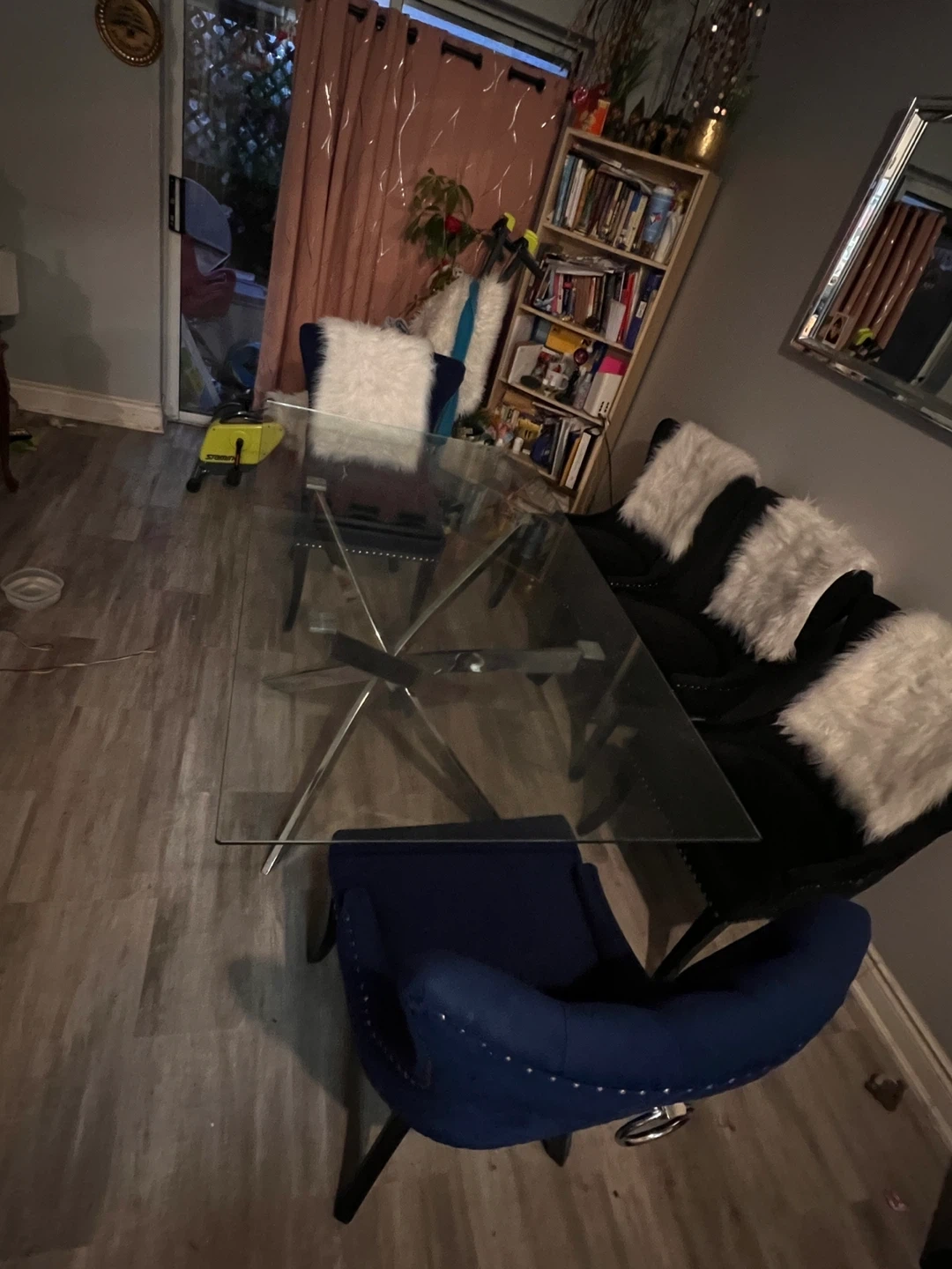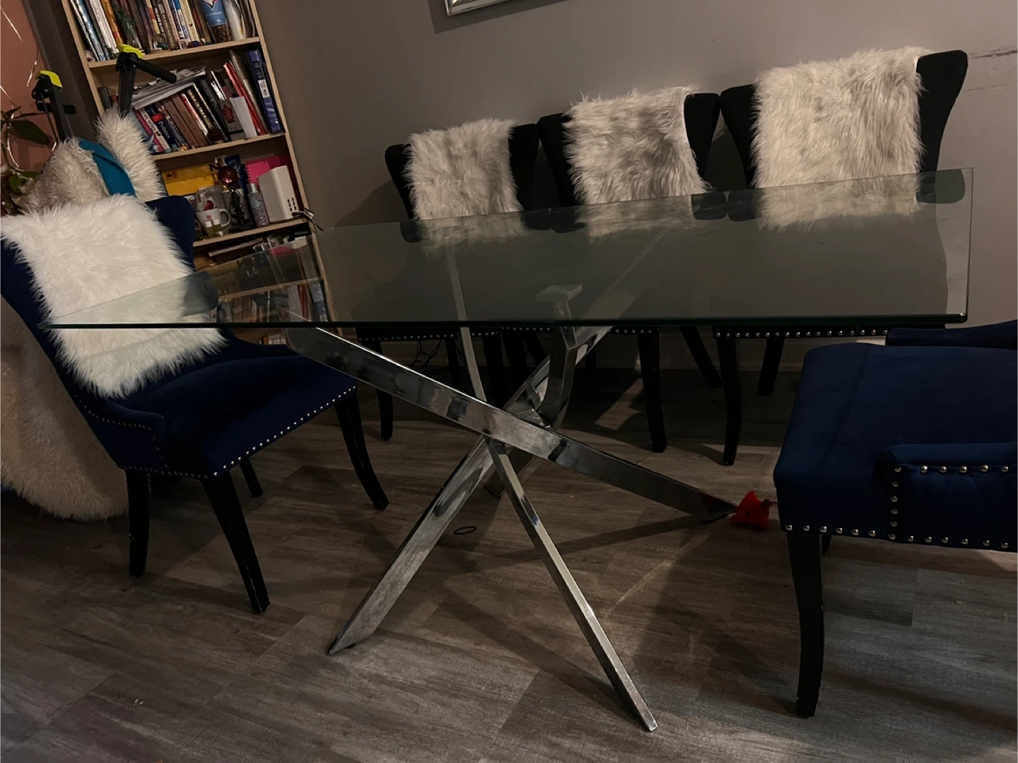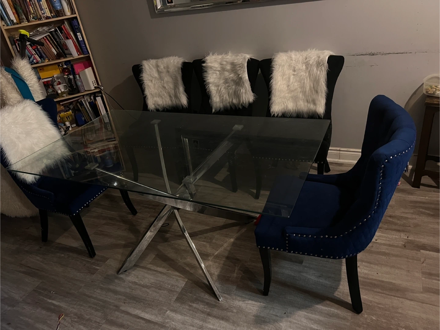 Selling my dinning room table. It is a glass table, very good big size. It is very strong. It comes with 5 chairs 2 navy blue color and 3 black. The chairs are very strong. I bought it at ikea a few years ago. I am moving and would have no room for it at my new place. Please message if interested!