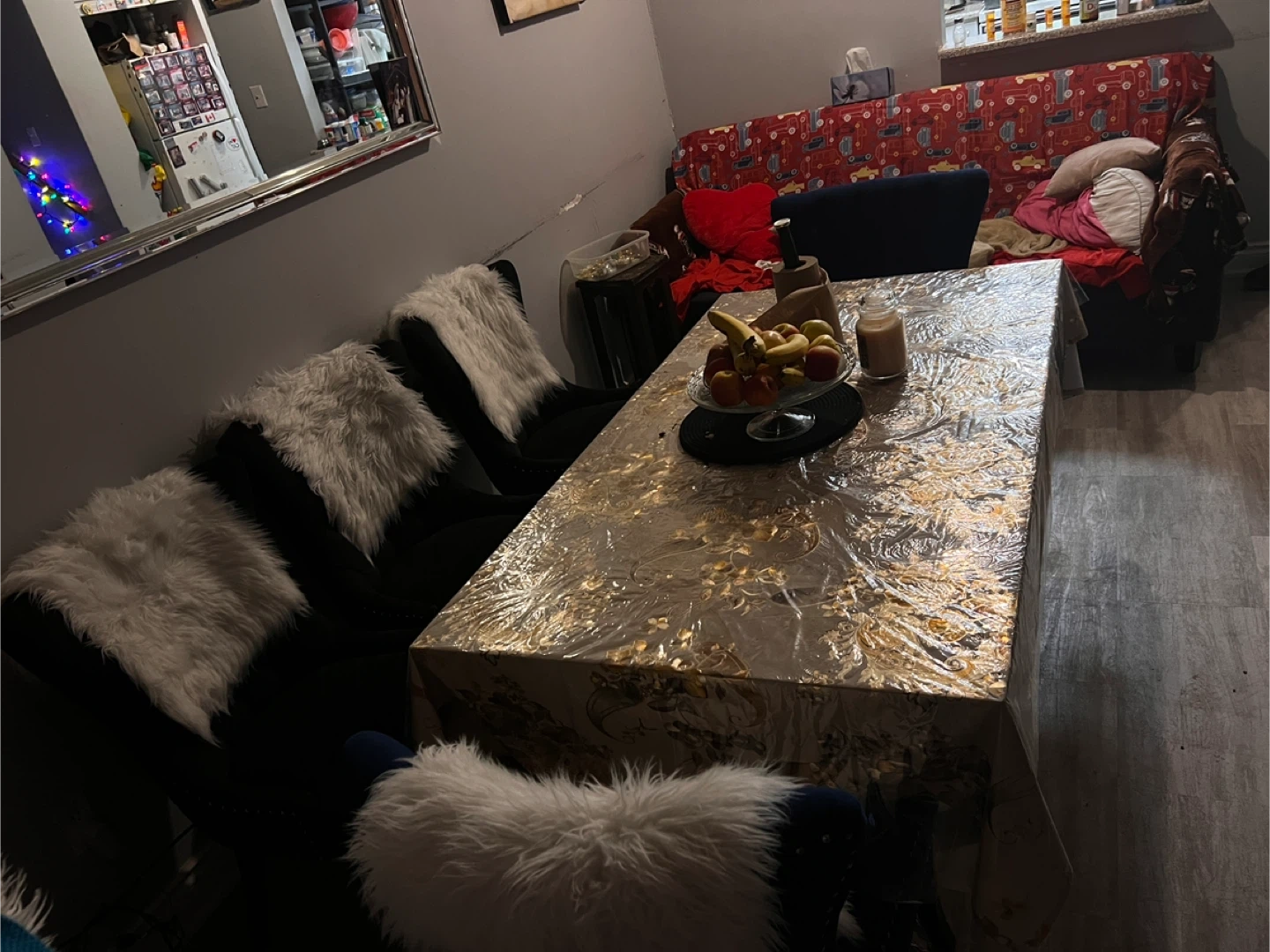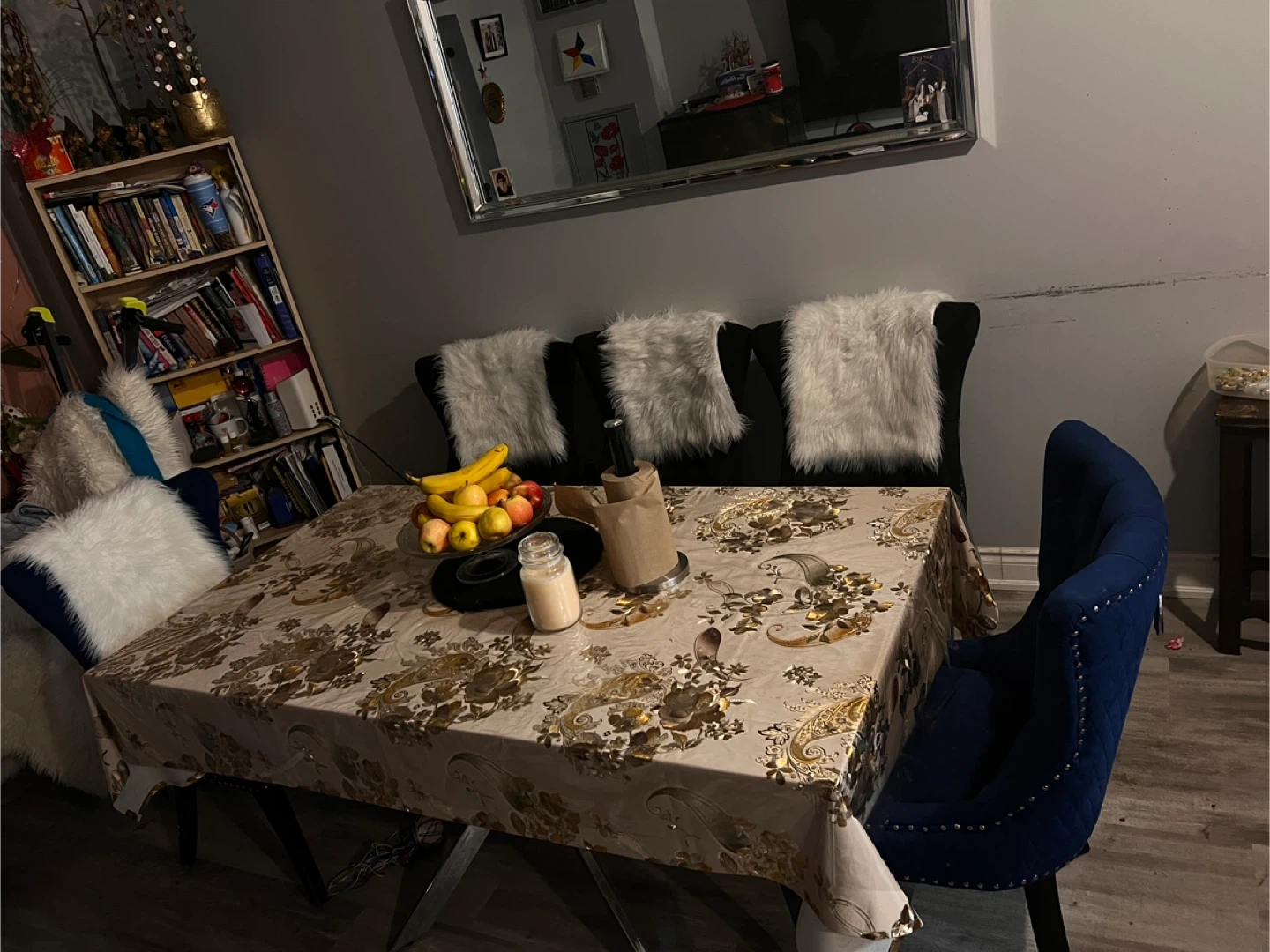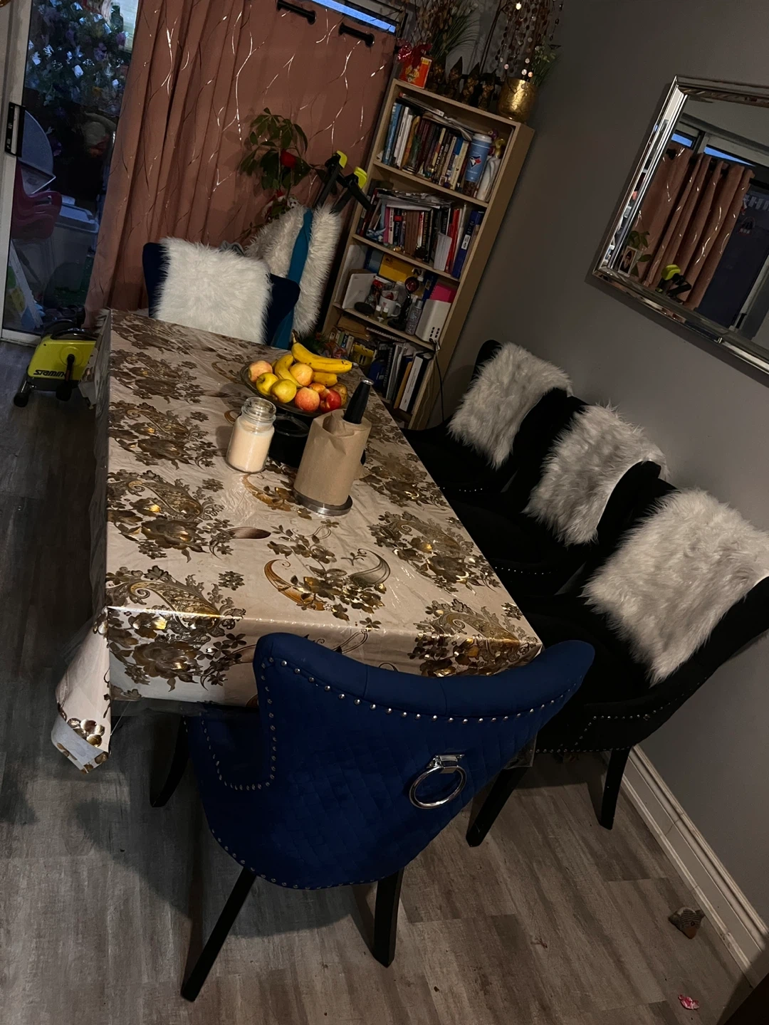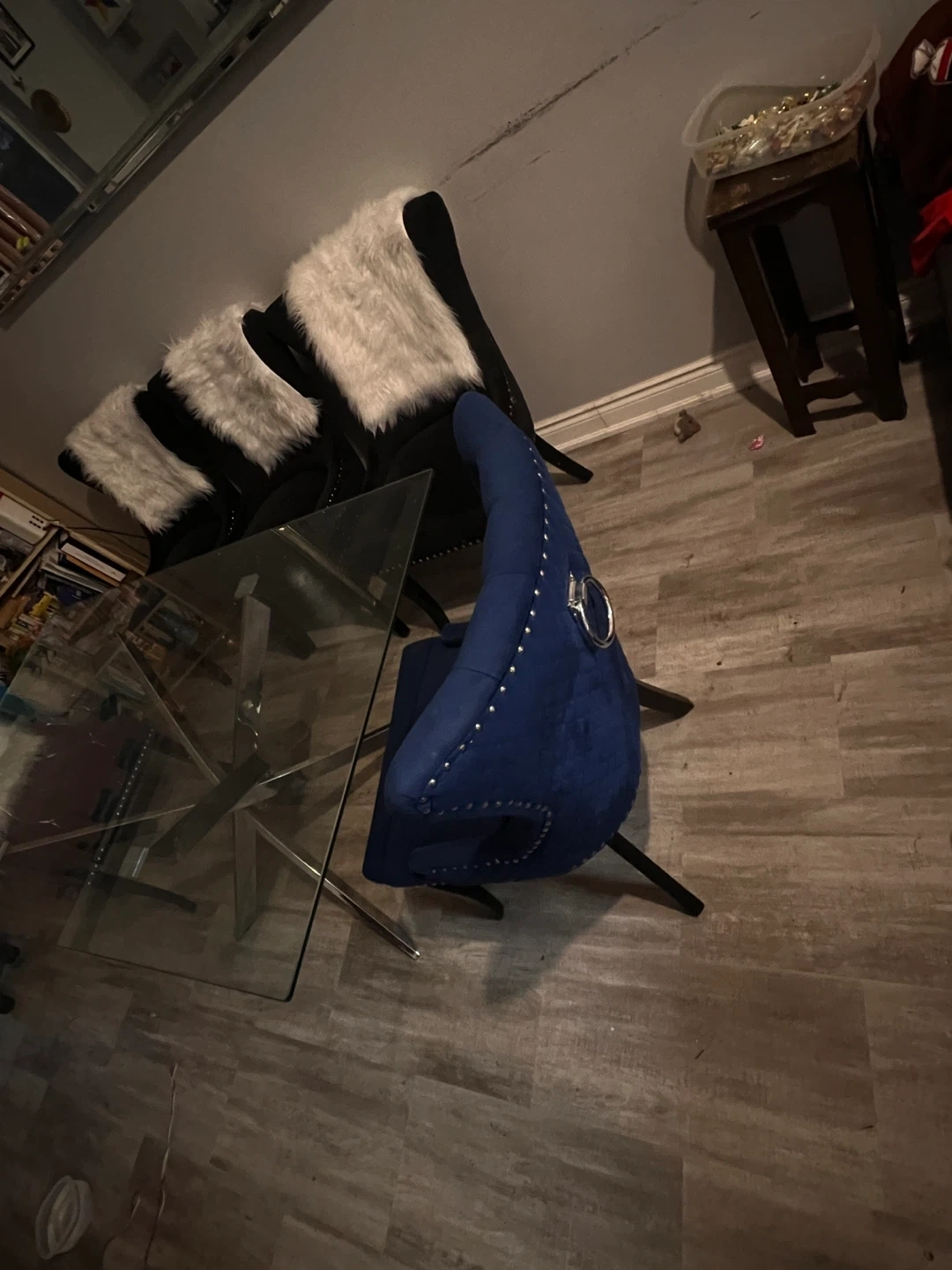 Selling my dinning room table. It is a glass table, very good big size. It is very strong. It comes with 5 chairs 2 navy blue color and 3 black. The chairs are very strong. I bought it at ikea a few years ago. I am moving and would have no room for it at my new place. Please message if interested!