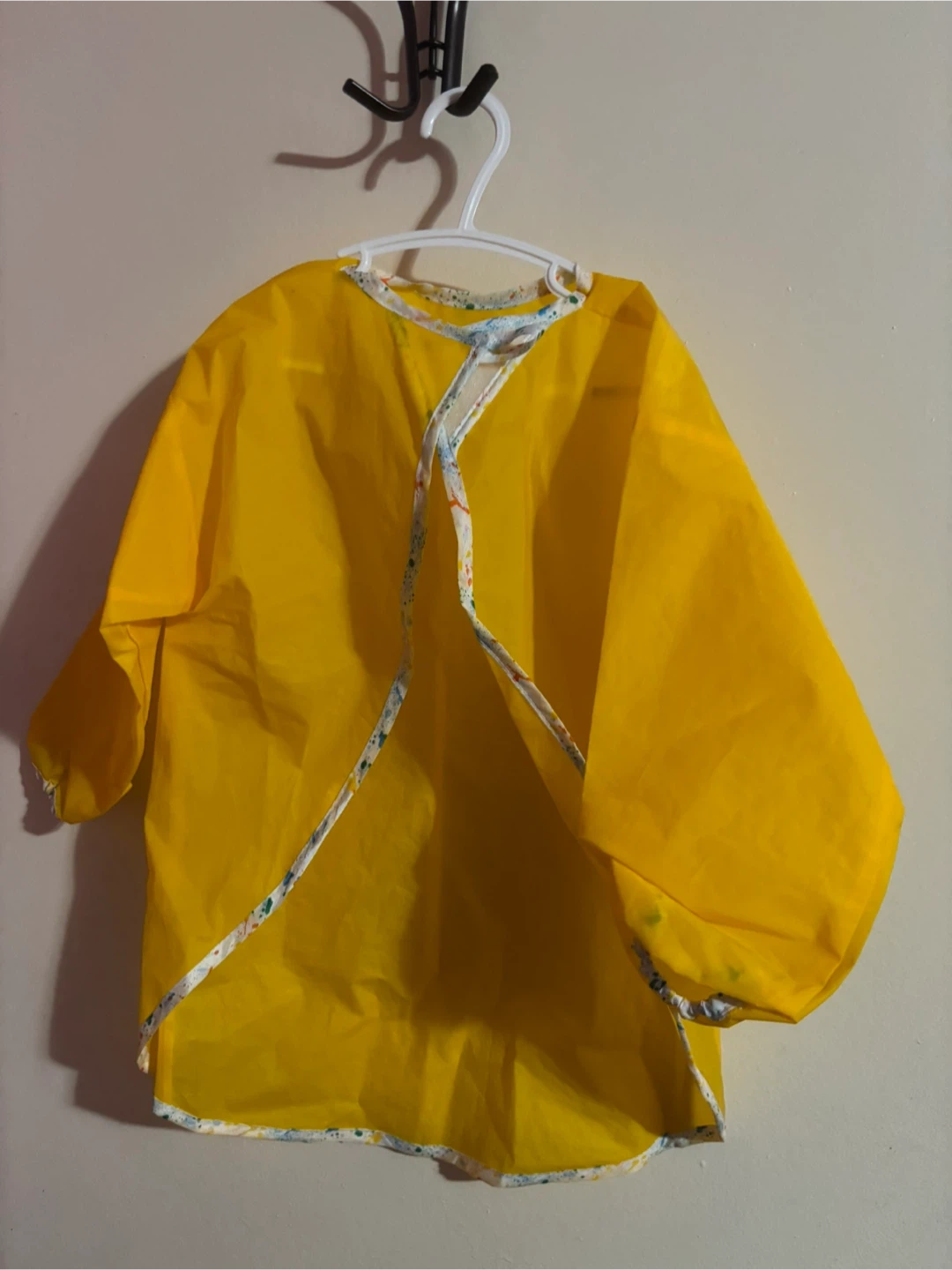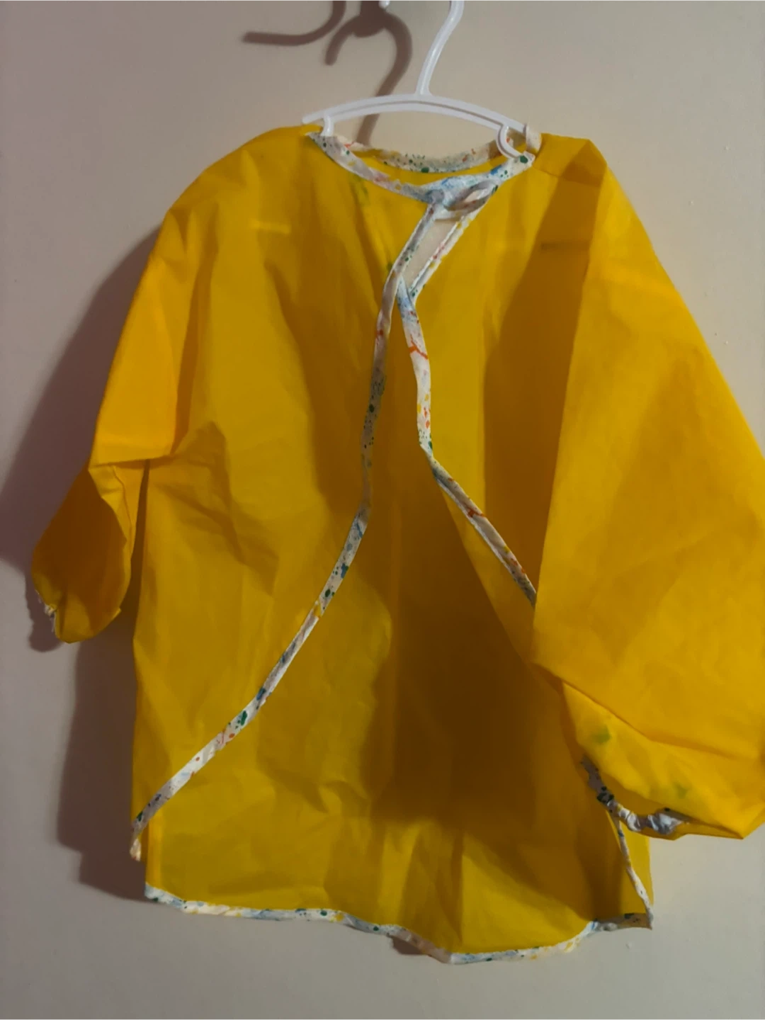 Here's a bright yellow smock apron, perfect for keeping your little one clean during messy activities like painting or eating! It's in great condition and ready for a new artist or foodie