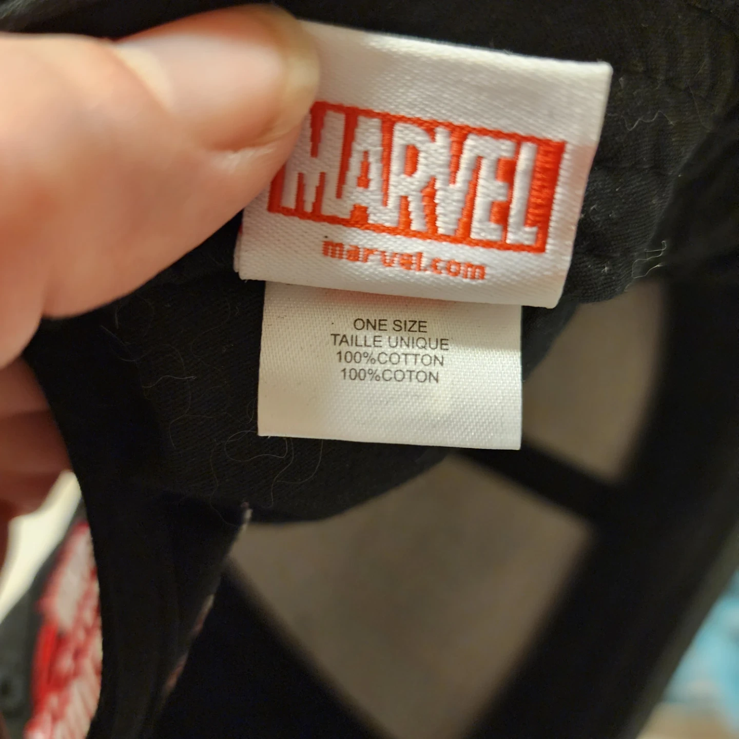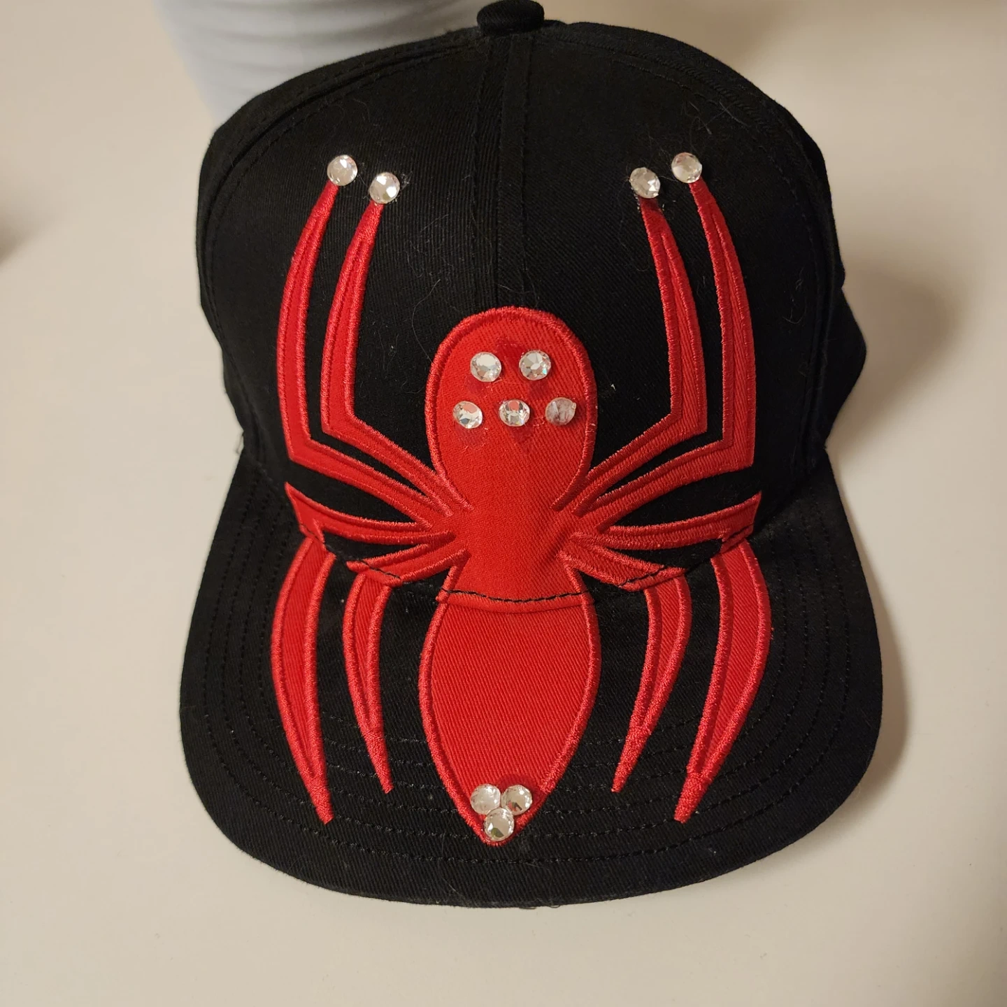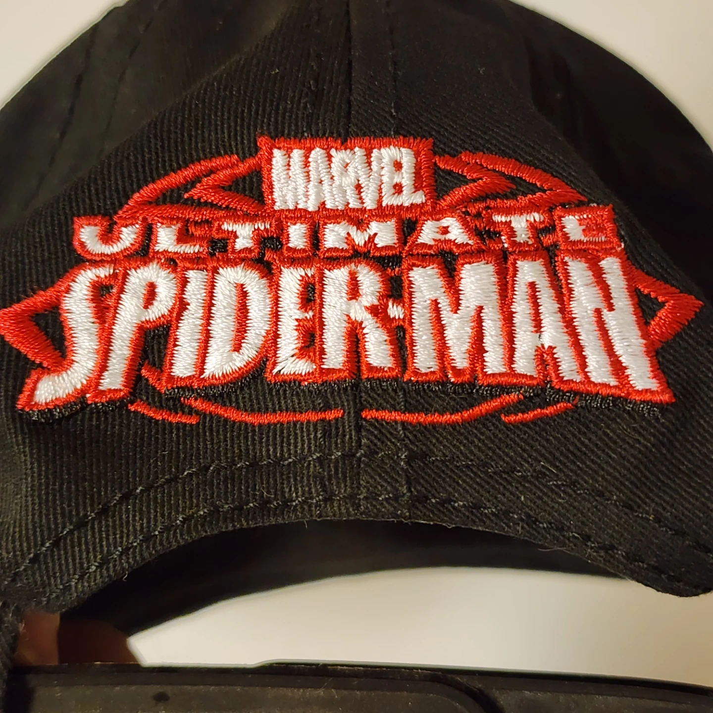 Selling a Marvel Ultimate Spider-Man hat! It's black with a red spider design and some sparkly accents. The material is 100% cotton. One size fits all!