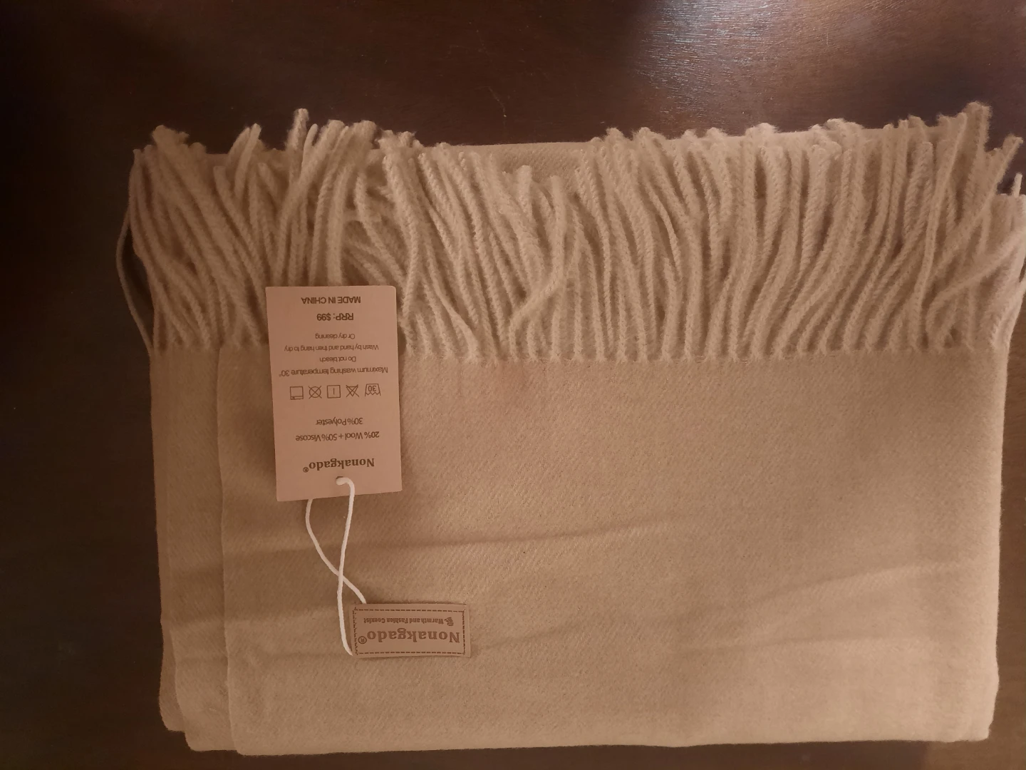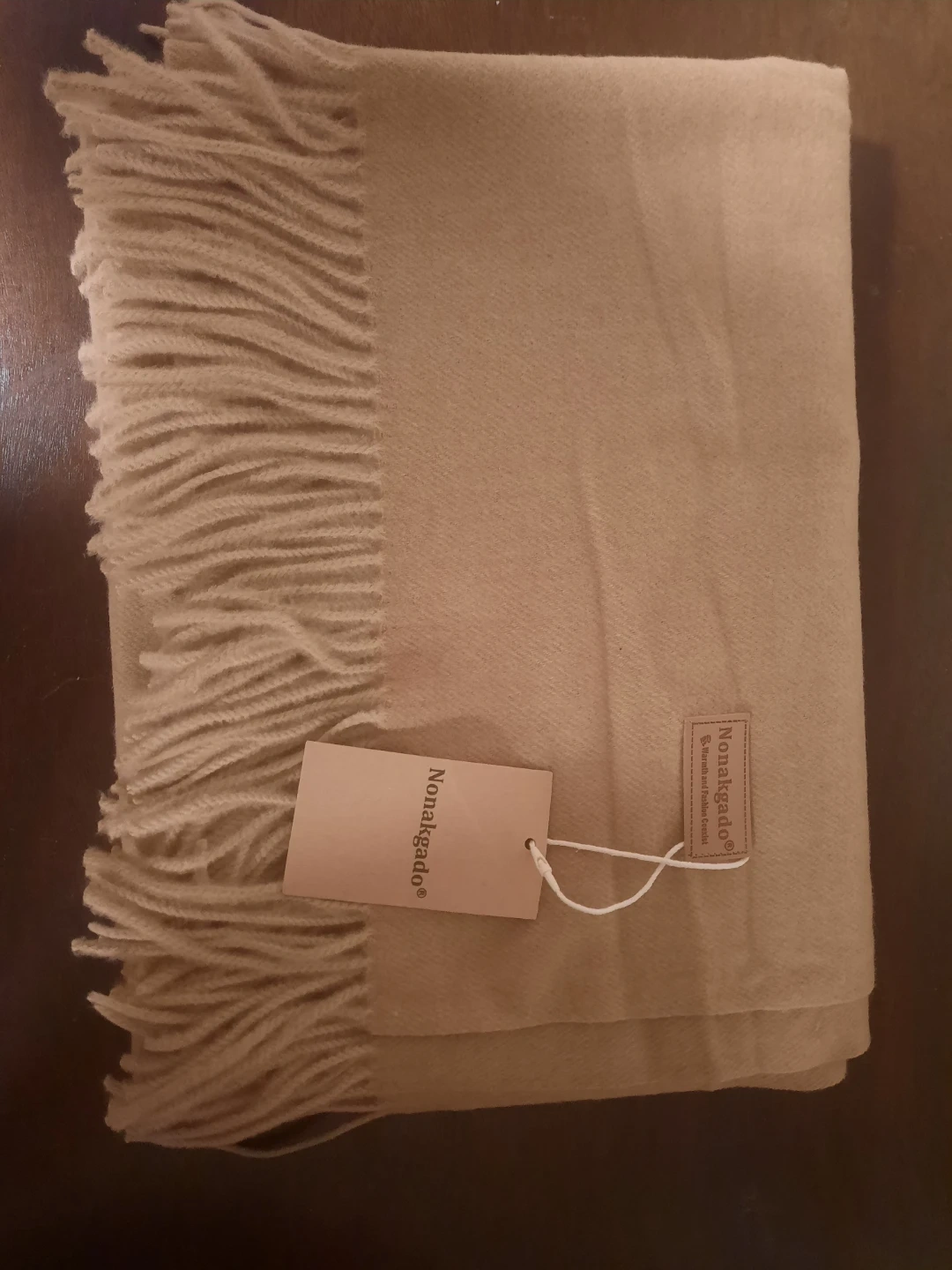 This Nonakgado scarf is brand new with tags! It's a lovely beige colour and made of 20% wool and 50% viscose. 30 % polyester It's super soft and warm, perfect for chilly days