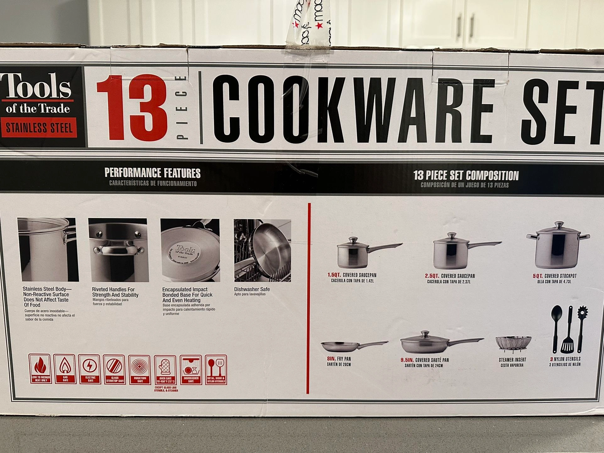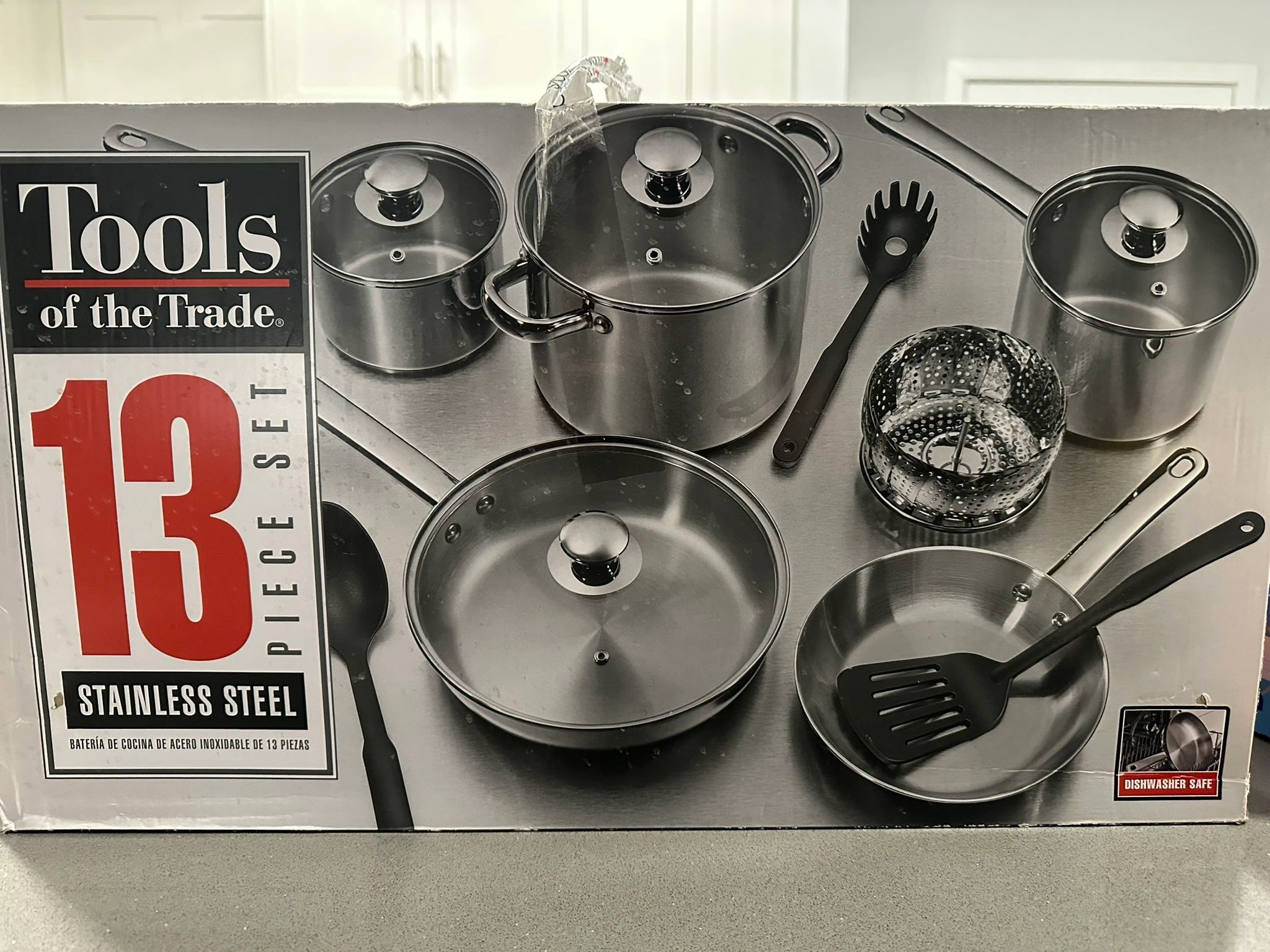 Brand new Tools of the Trade 13-piece stainless steel cookware set, still in the original box. Durable stainless steel construction with riveted handles and encapsulated base for even heating. Dishwasher safe and compatible with gas, electric, and induction stovetops.