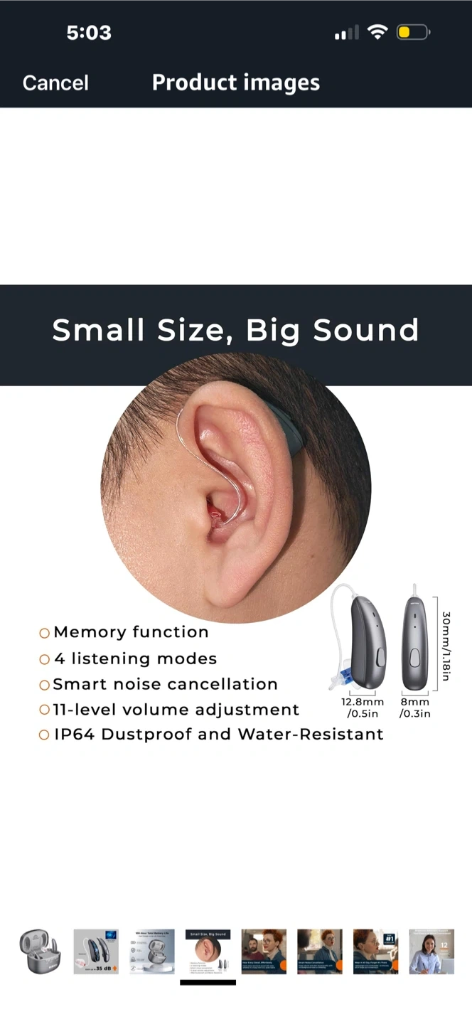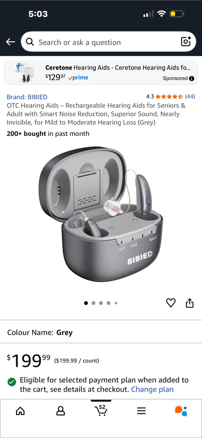 Selling a pair of BIBIED OTC rechargeable hearing aids in grey. These are designed for seniors and adults with mild to moderate hearing loss. They feature smart noise reduction and superior sound quality.