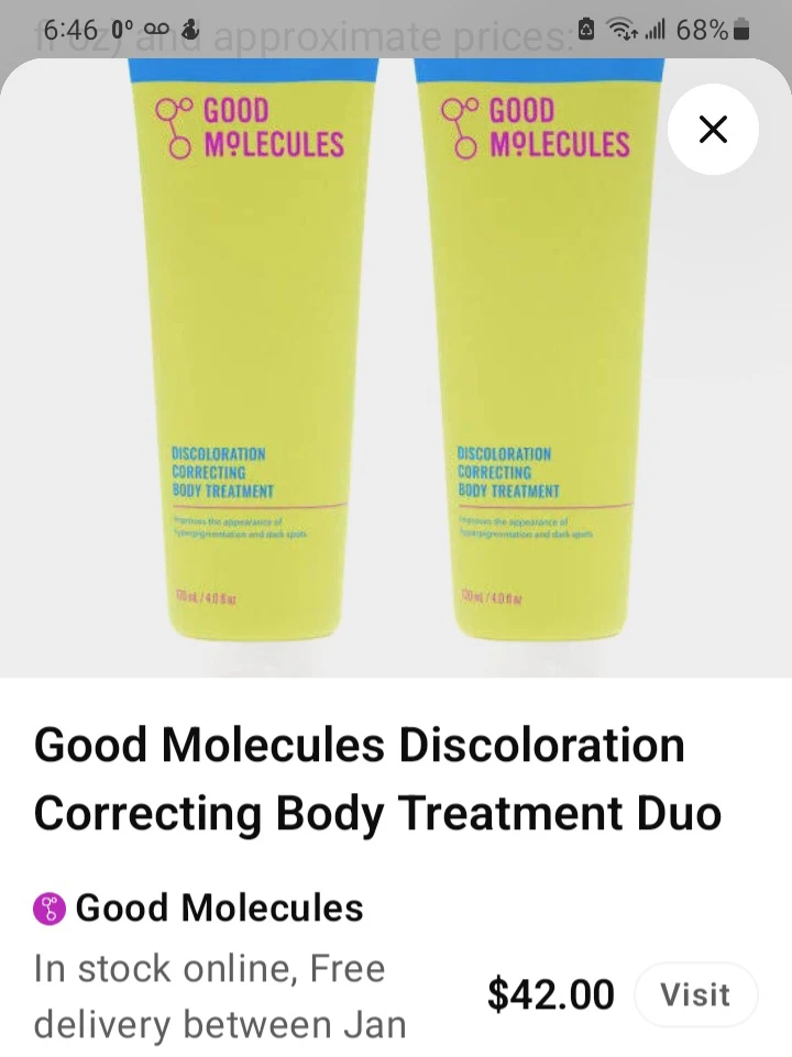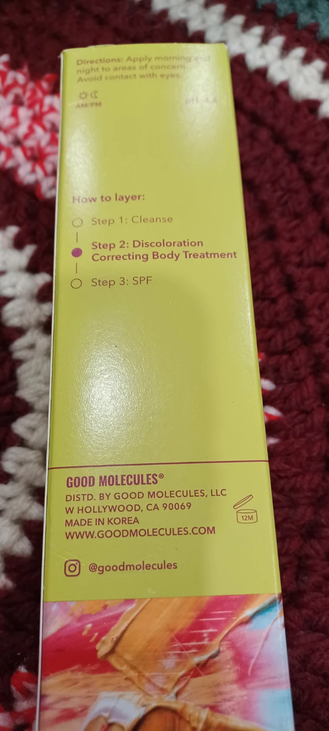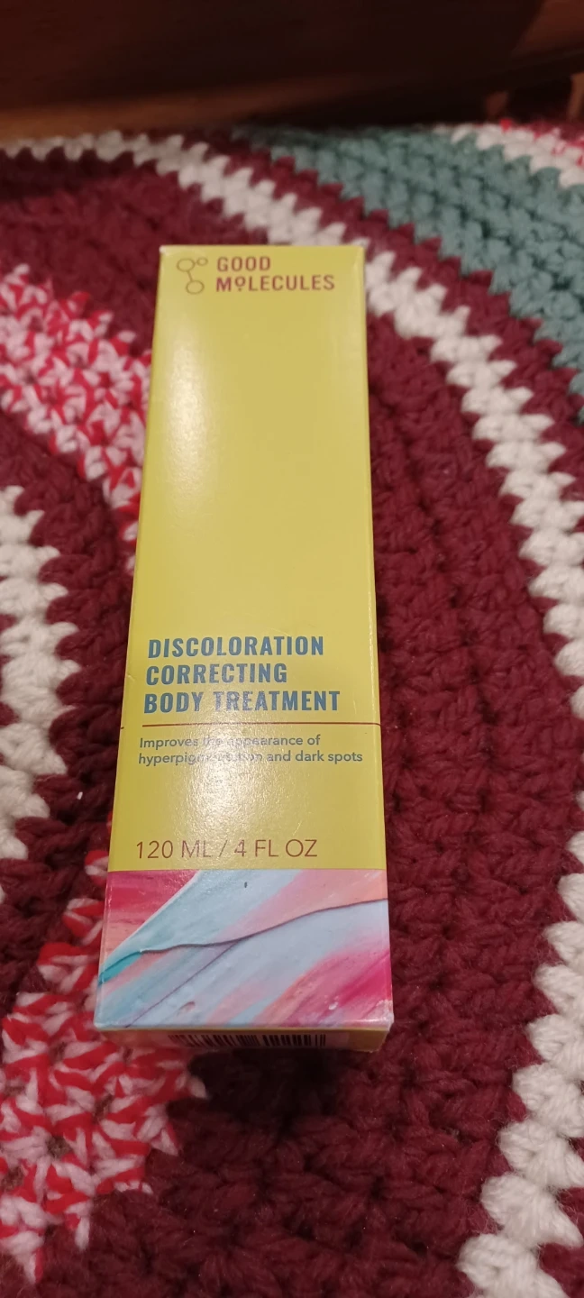 Selling a Good Molecules Discoloration Correcting Body Treatment. This treatment improves the appearance of hyperpigmentation and dark spots. It contains 120 mL / 4 fl oz. It's designed to be used as step 2 in your skincare routine, after cleansing and before SPF. Contains ingredients like water, glycerin, and niacinamide.