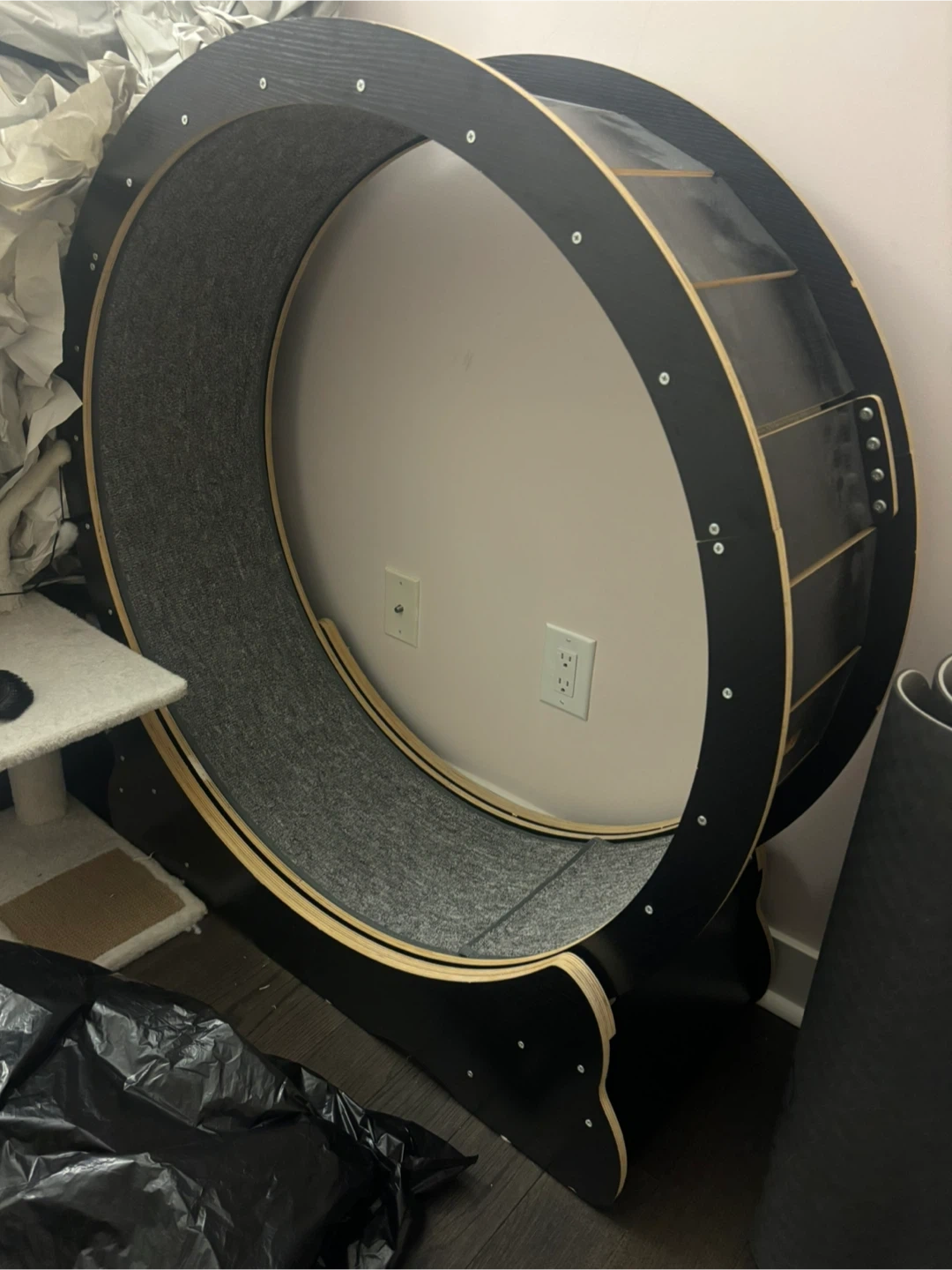 Here's a great cat exercise wheel! It's in good condition and ready for a new feline friend to use. Perfect for keeping your kitty active and entertained. Large size. Unused. Cash only. You come and grab from intersection of John/Adelaide.