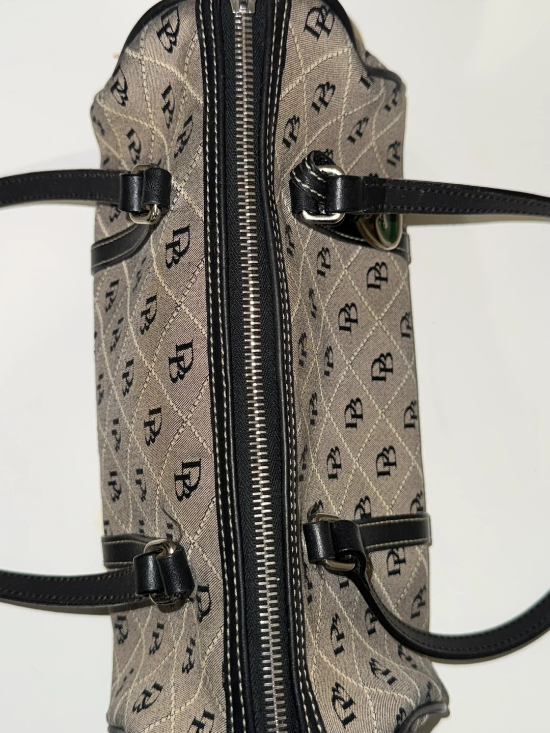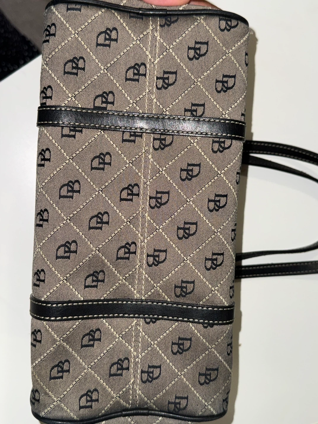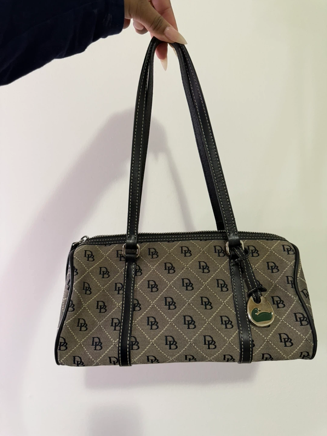This is a Dooney & Bourke shoulder bag featuring the classic DB monogram pattern. The bag has black leather straps and trim, and a silver zipper. The interior has a beige lining with a zippered pocket.