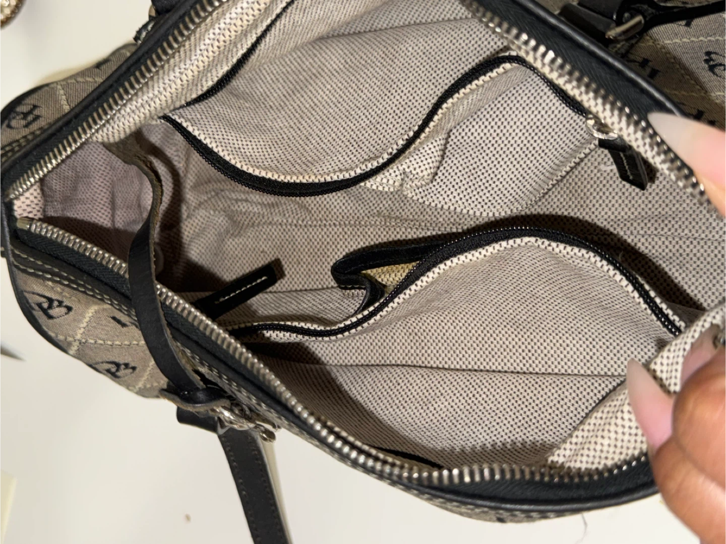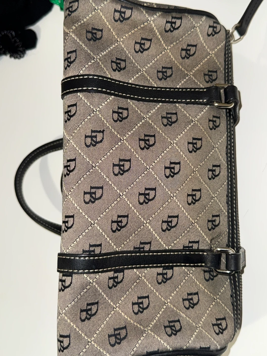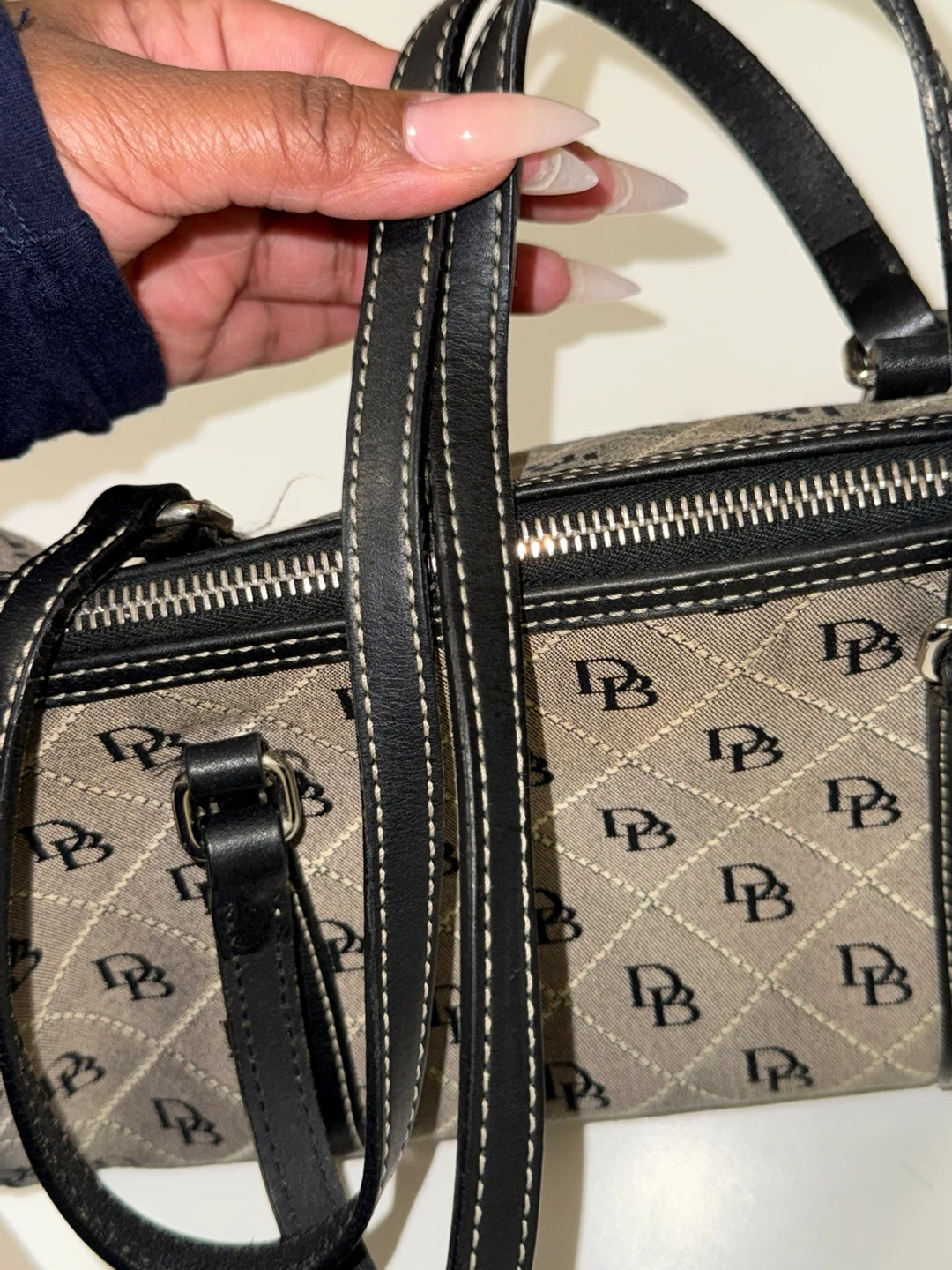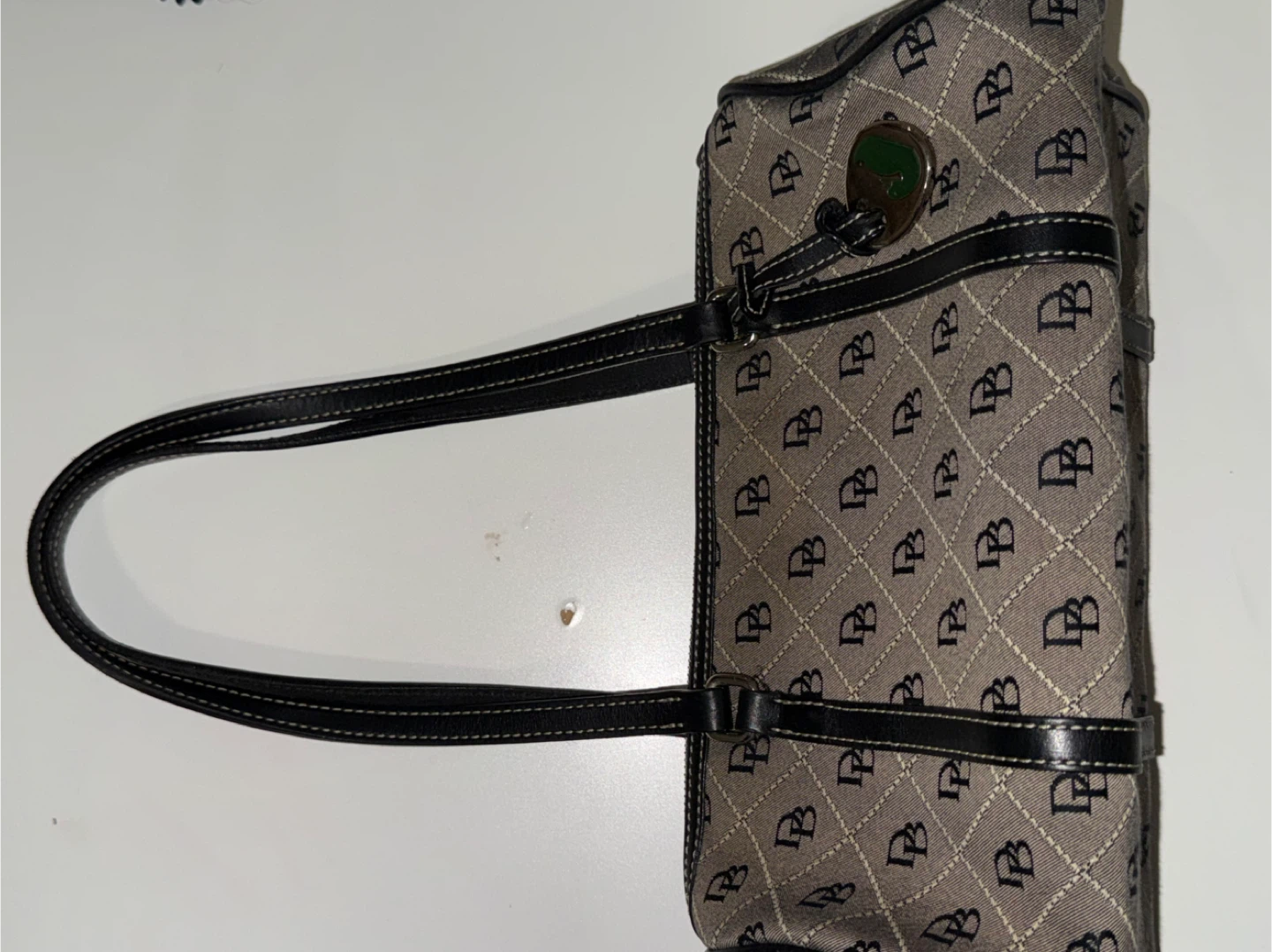 This is a Dooney & Bourke shoulder bag featuring the classic DB monogram pattern. The bag has black leather straps and trim, and a silver zipper. The interior has a beige lining with a zippered pocket.