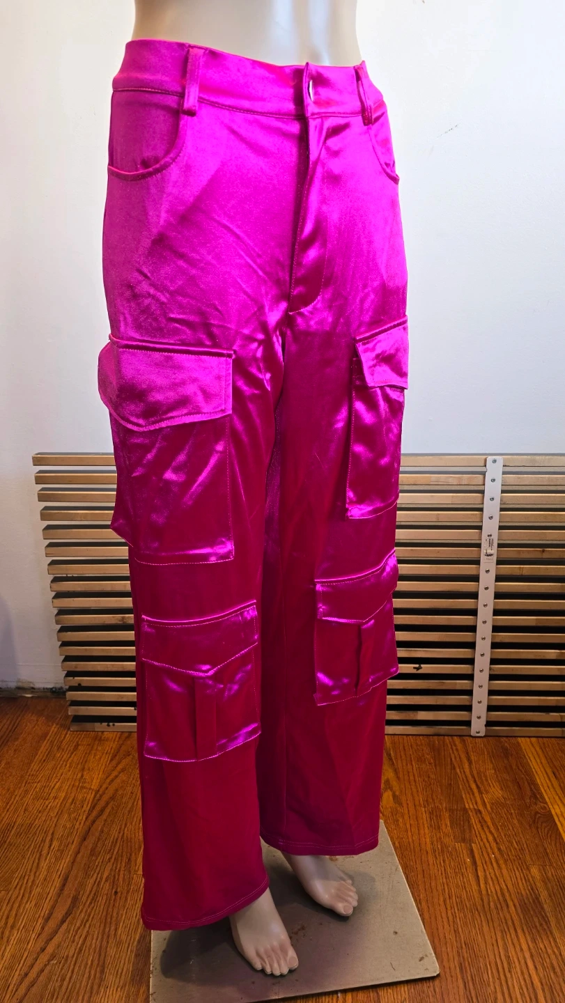 Selling a pair of vibrant pink cargo pants in size XS! Thick stretchy satin Made of 95% polyester and 5% elastane, these pants are sure to make a statement. They have never been worn and are ready to strut