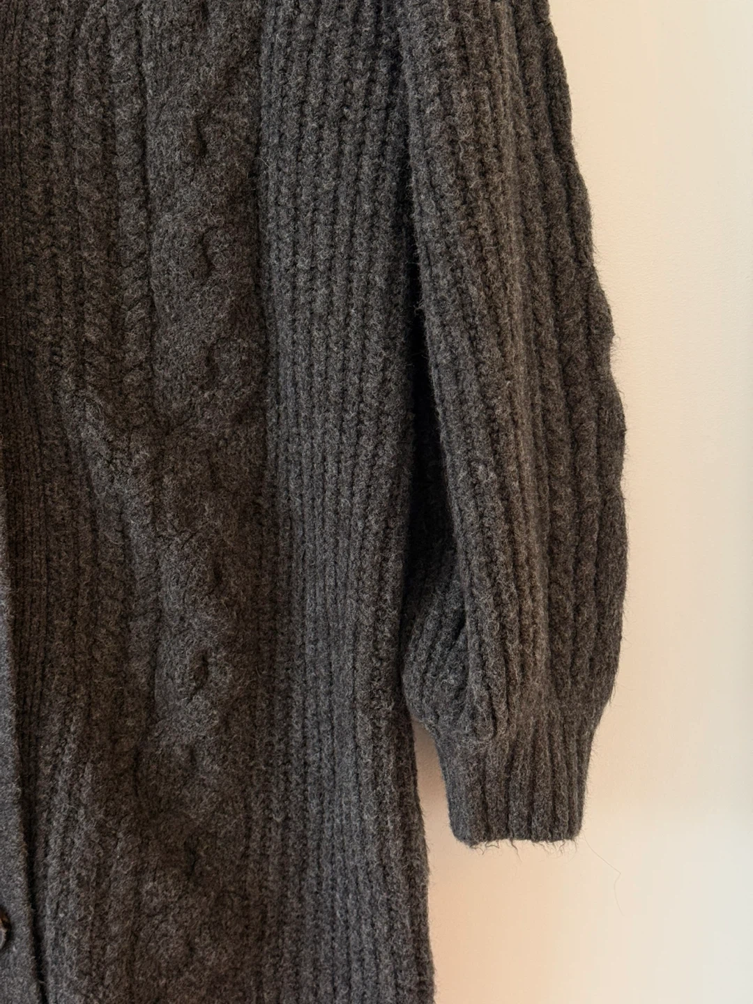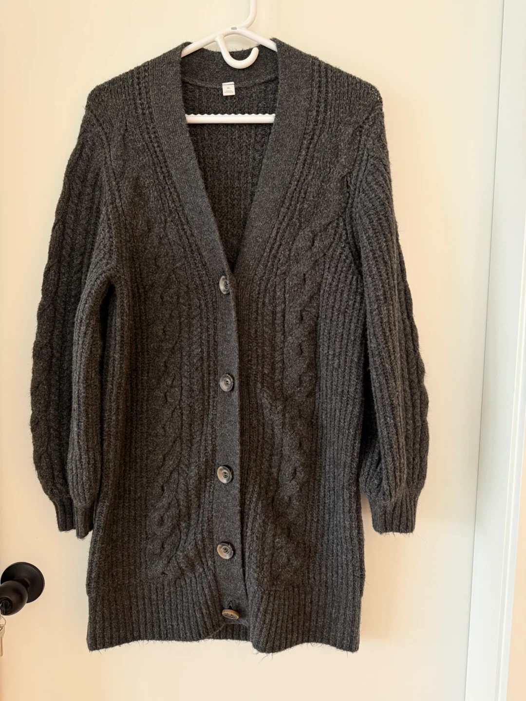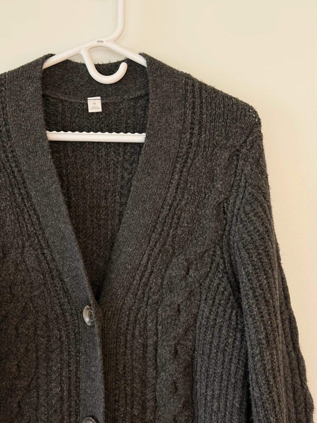 Cozy up in this charcoal grey cable knit cardigan from Old Navy! It's an XL and perfect for layering on those chilly days. The material is soft and the cable knit design adds a touch of classic style to any outfit