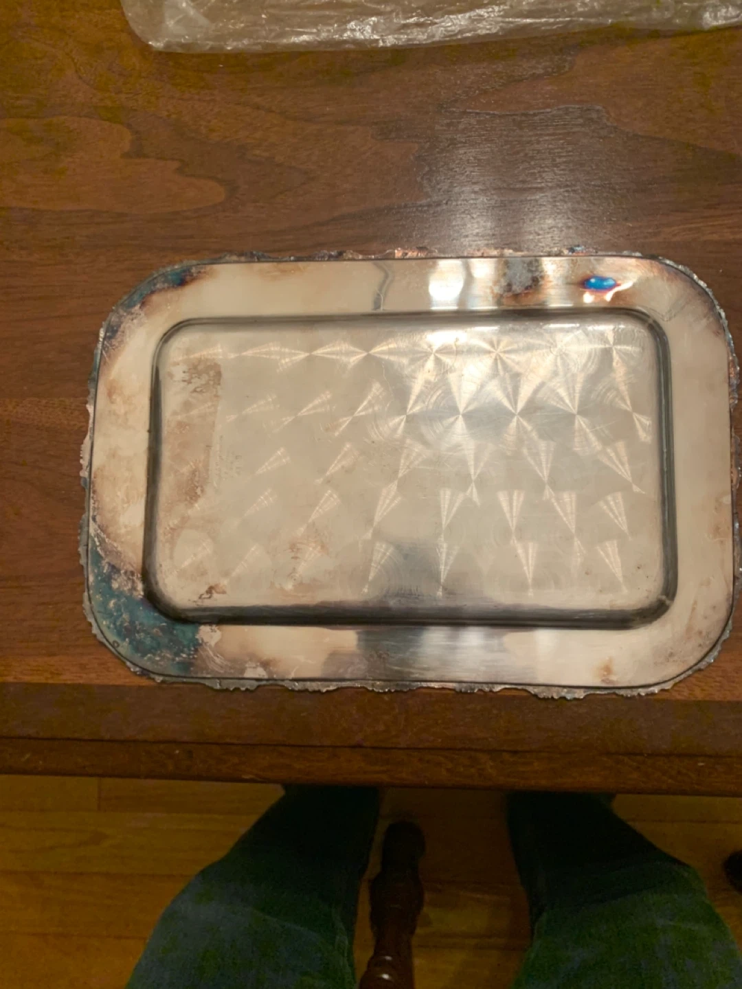 Selling a WM. A. Rogers Old English Reproduction tray. It is silver plated copper with a decorative grape motif around the edge. It has some signs of wear and tarnishing, but still has a lot of charm