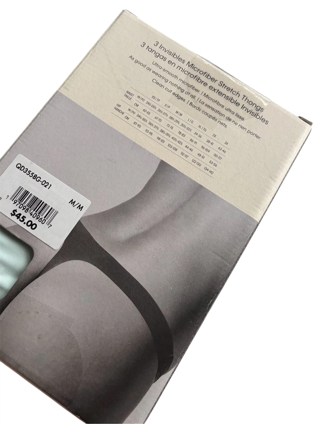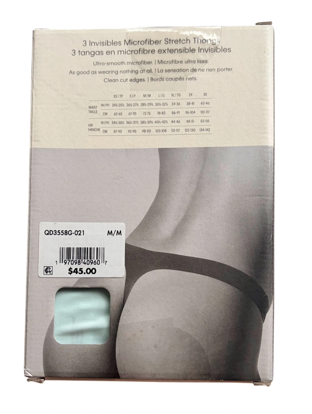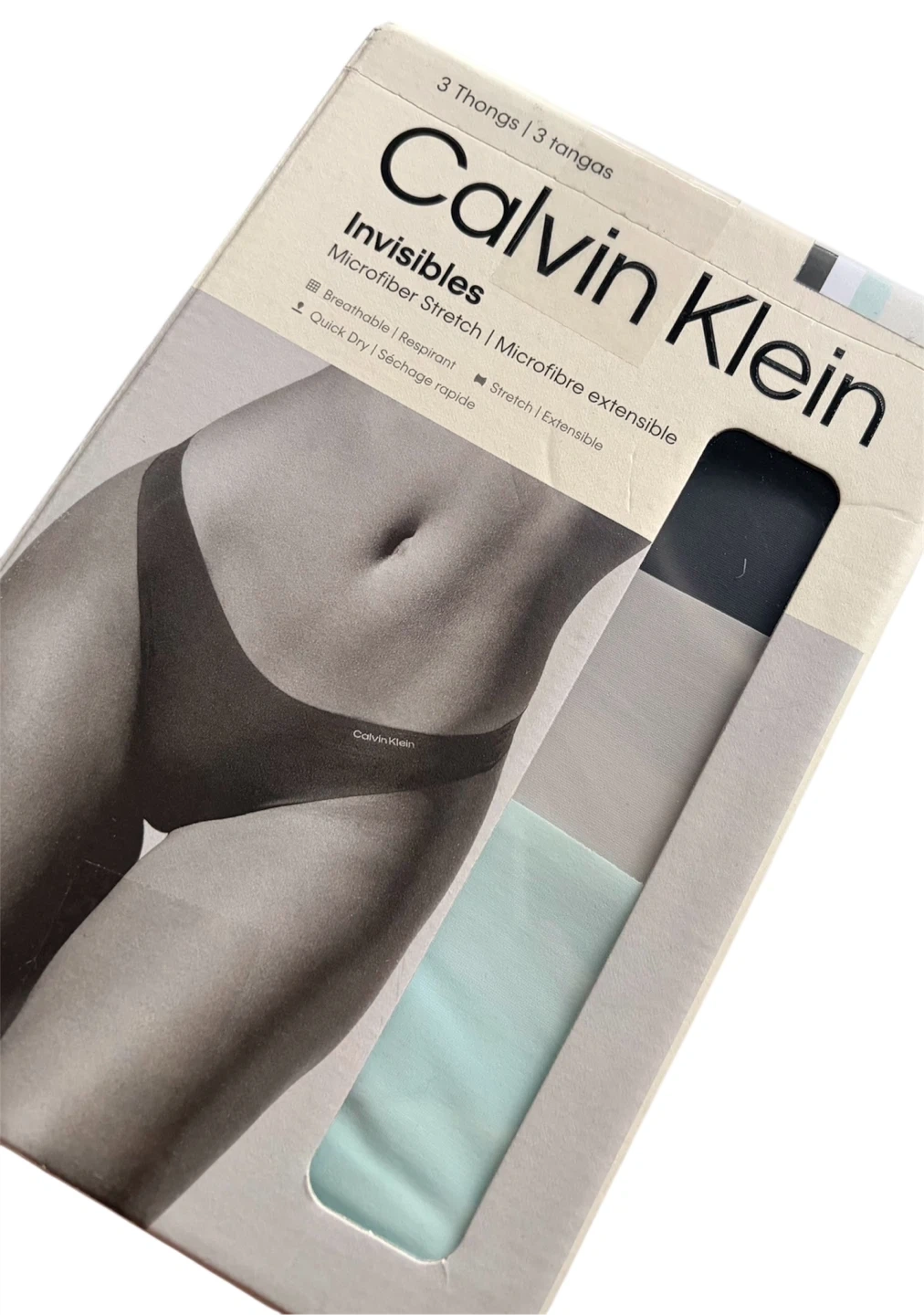 Calvin Klein Invisibles Thongs offer sleek comfort. Three pairs Black, gray and light blue. Microfibre stretch for easy wear.