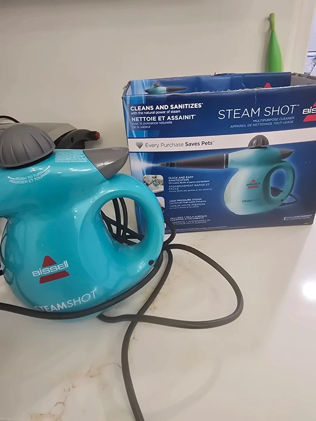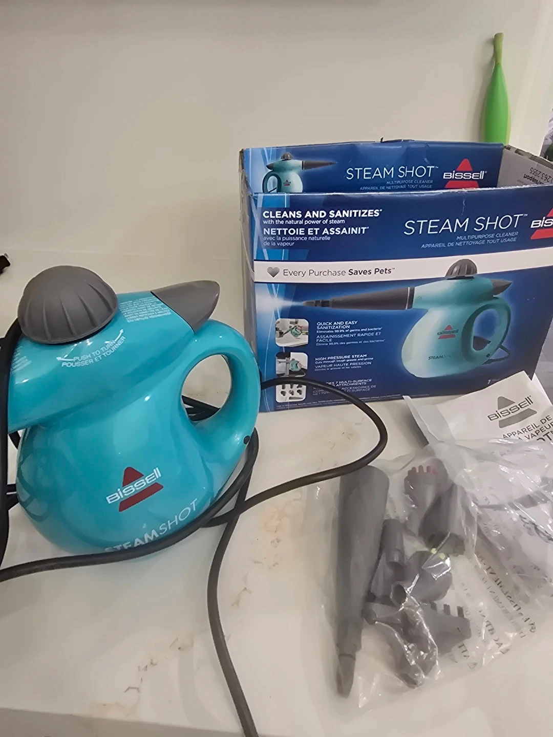 I'm selling a Bissell SteamShot hard surface steam cleaner. It cleans and sanitizes with the natural power of steam. It features quick and easy sanitization, eliminating 99.9% of germs and bacteria. It also has high pressure steam and includes 7 multi-surface tools. Every purchase saves pets!