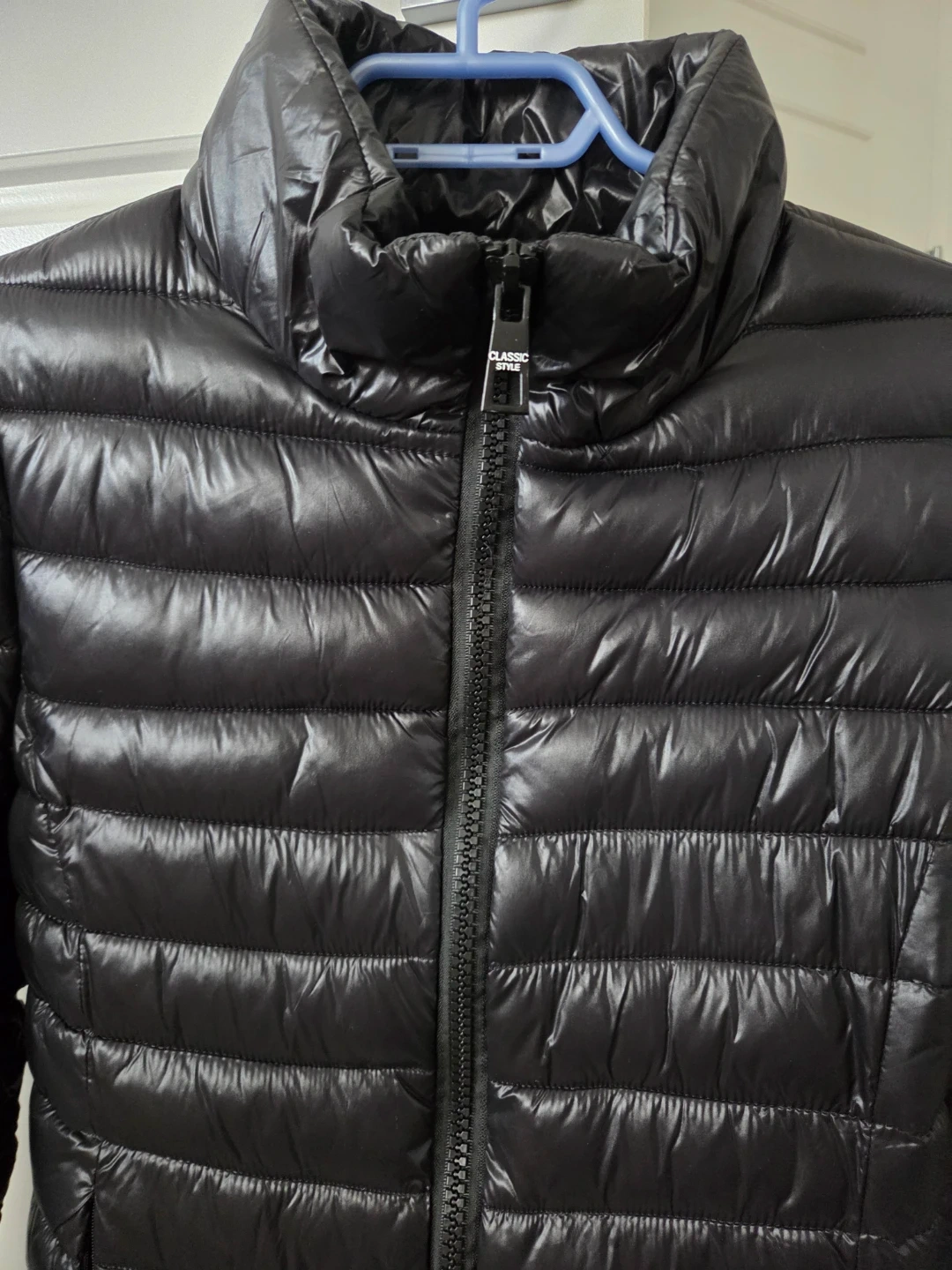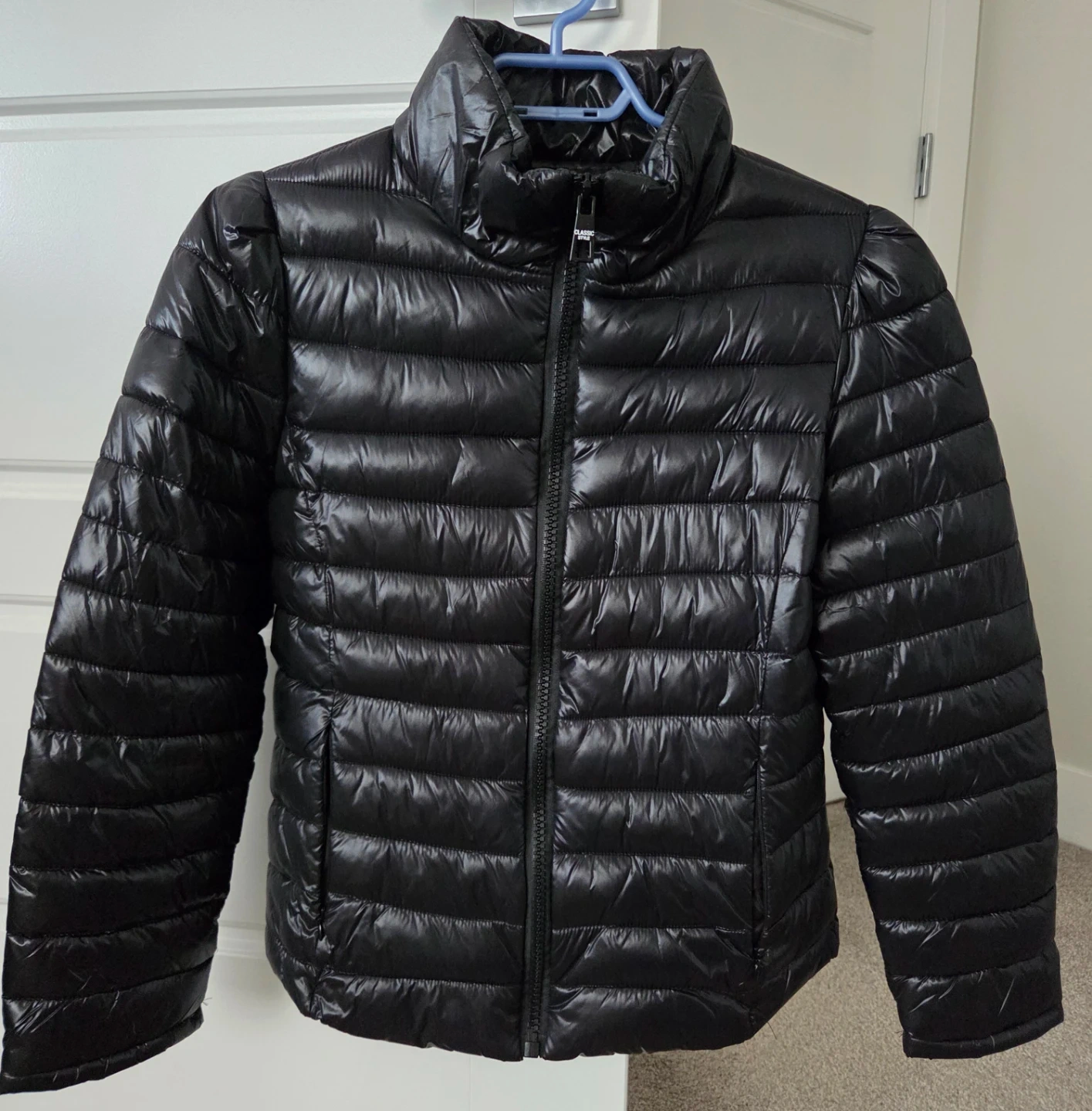 Hardly worn sleek black puffer jacket in excellent condition. Its like brand new and very lightweight with quilted design. The jacket features a full zip and ziper pockets. It doesn't say the size but its size small.
