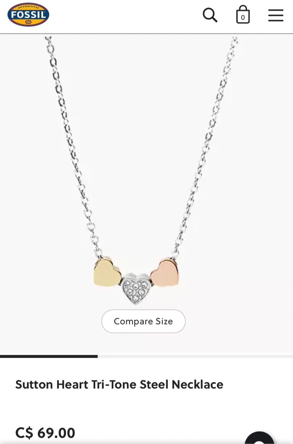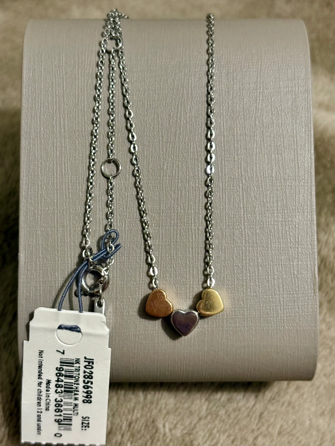 This is a Fossil Sutton Heart Tri-Tone Steel Necklace. It's a lovely necklace with silver chain and three heart pendants in gold, rose gold and silver. Originally bought for $69