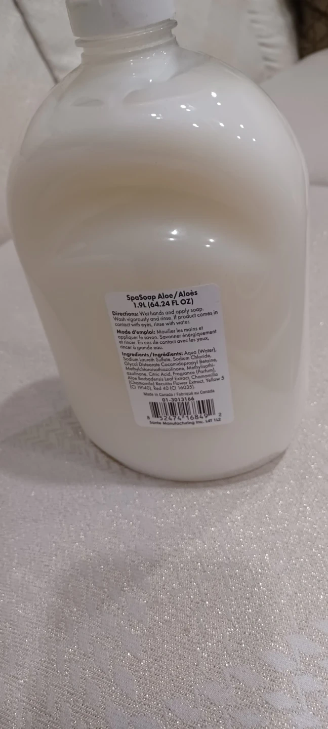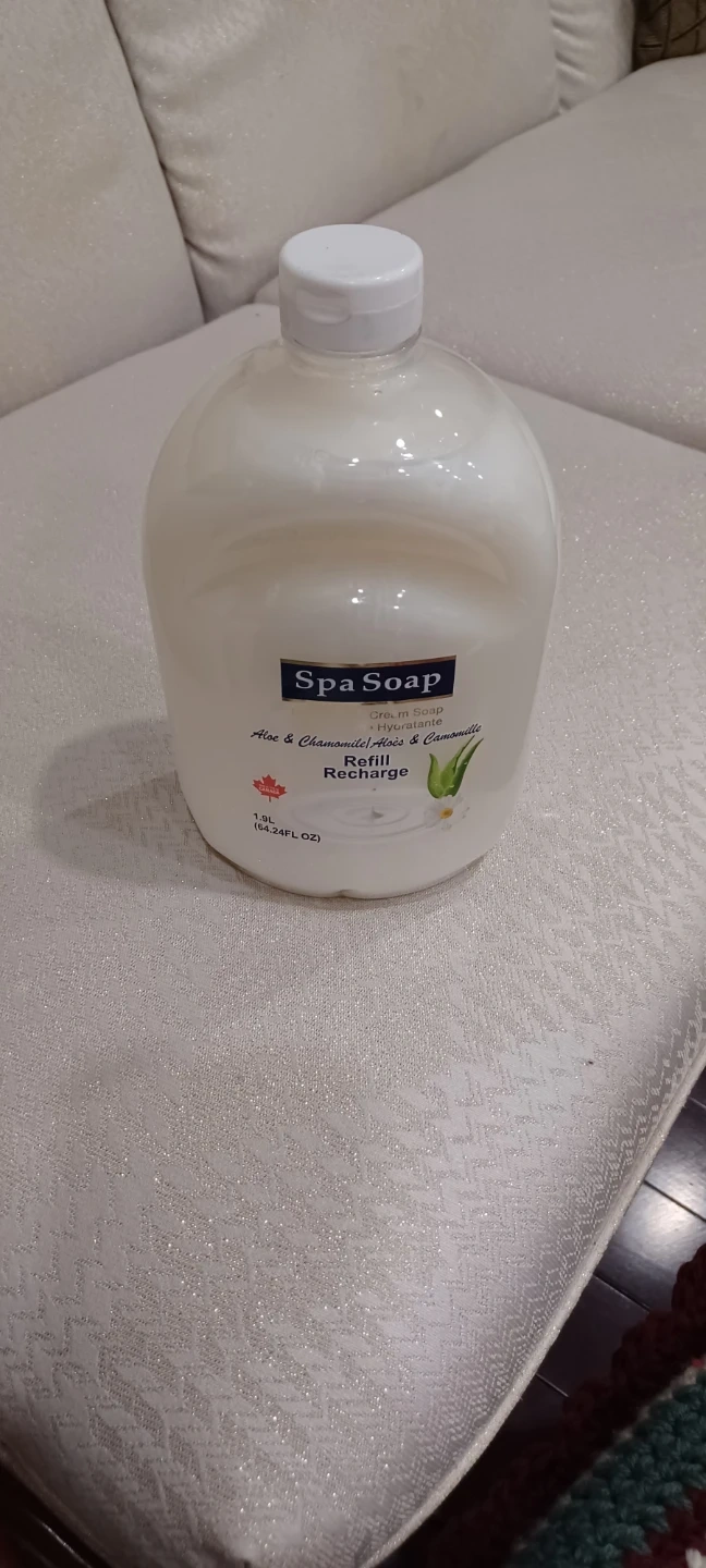 Selling a Spa Soap refill in Aloe & Chamomile scent. It's a large 1.9L bottle, perfect for refilling your soap dispensers. Enjoy the soothing scent of aloe and chamomile while keeping your hands clean.