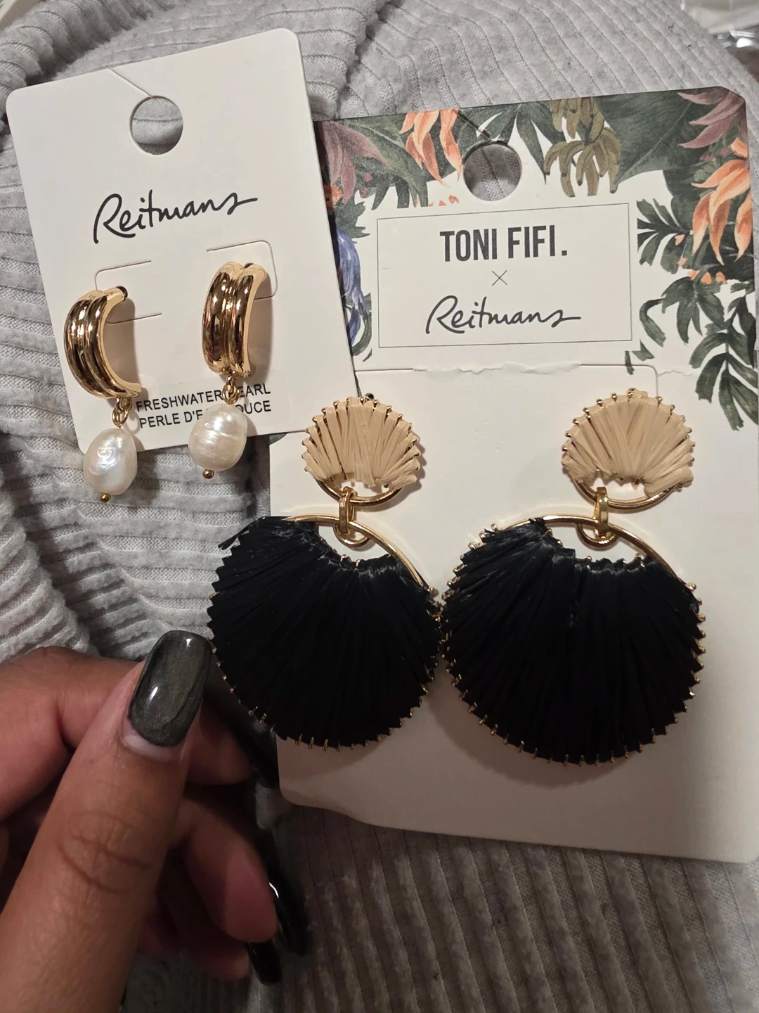 Two pairs of earrings from Reitmans! One pair is gold with freshwater pearls. The other pair is a Toni Fifi collaboration with Reitmans, featuring a straw and black design