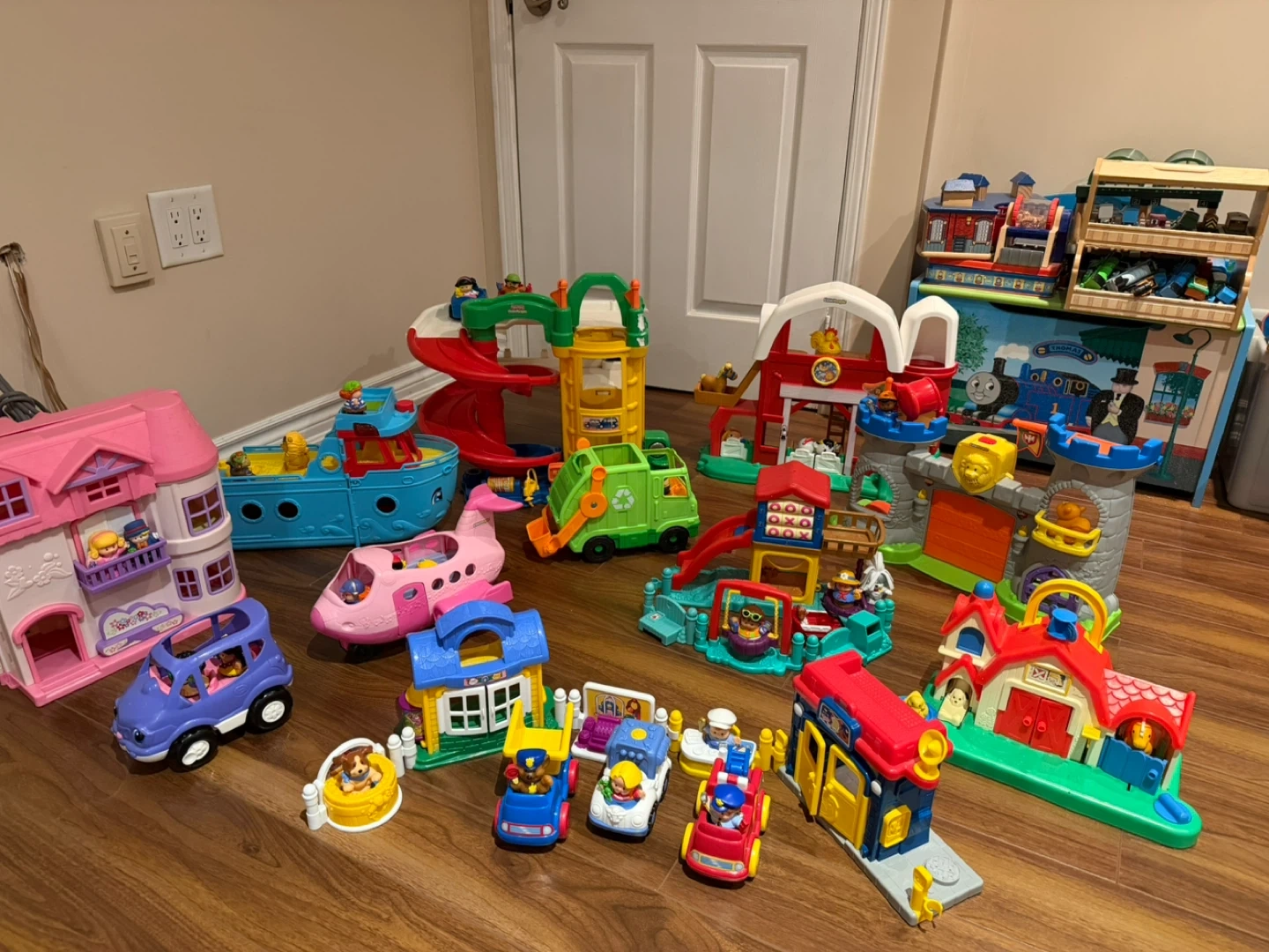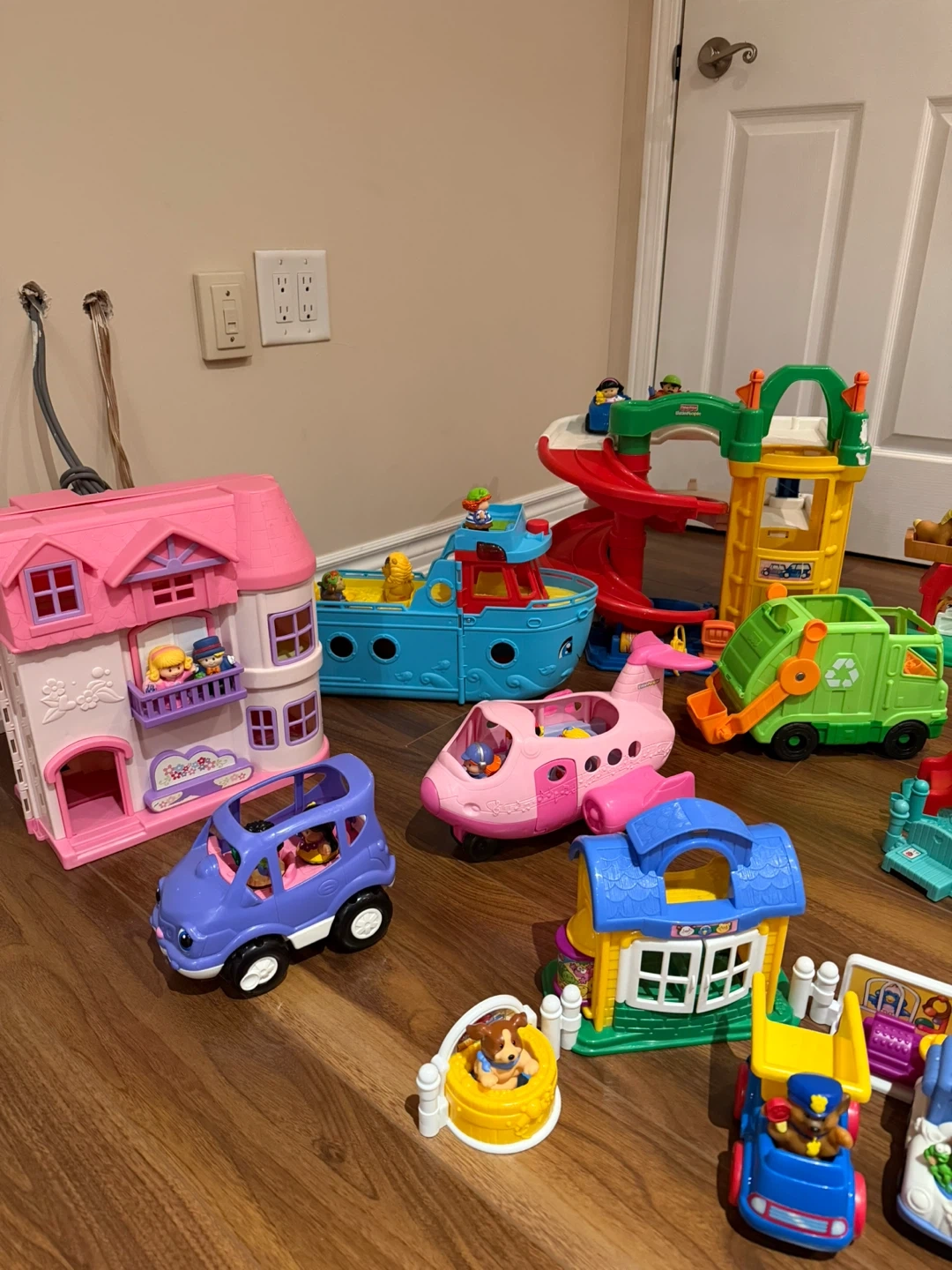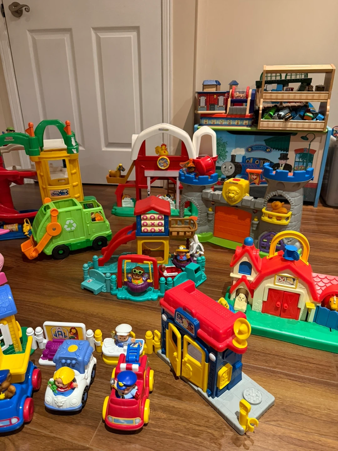 Little people city center, car ramp, peek a boo farm, farm, plane, school, castle, garbage truck, etc