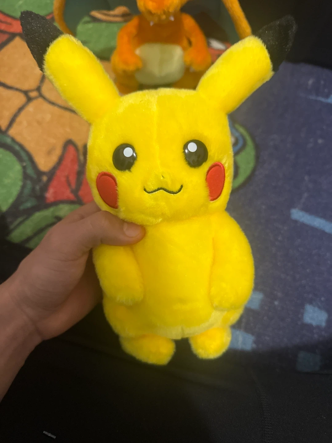 Selling a cute Pikachu plush! It's in great condition and ready for a new home. The plush is yellow with brown accents and features the classic Pikachu design. Perfect for any Pokémon fan!