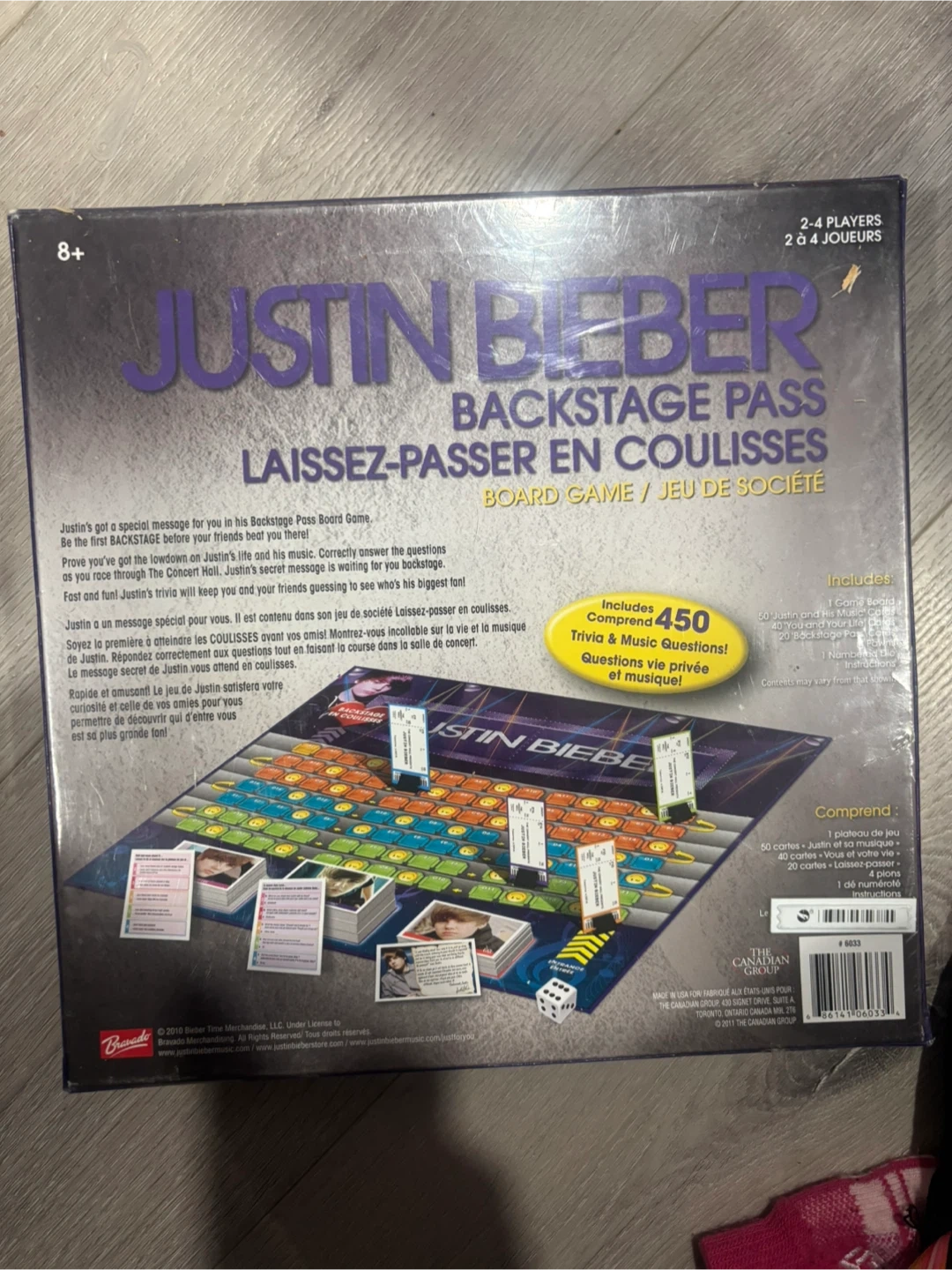 Selling a Justin Bieber Backstage Pass board game. It's suitable for 2-4 players and ages 8+. Includes 450 Trivia & Music Questions! The box is included
